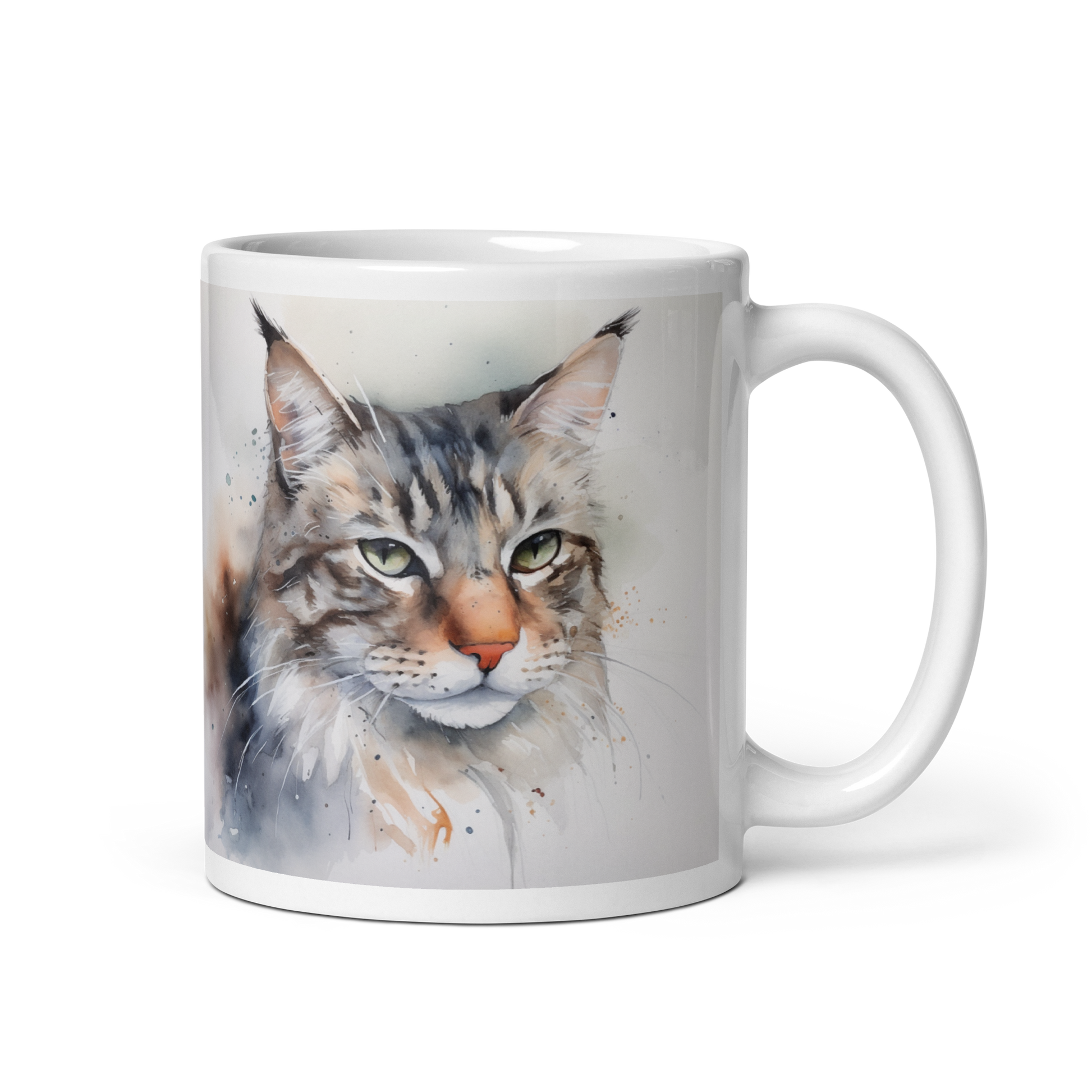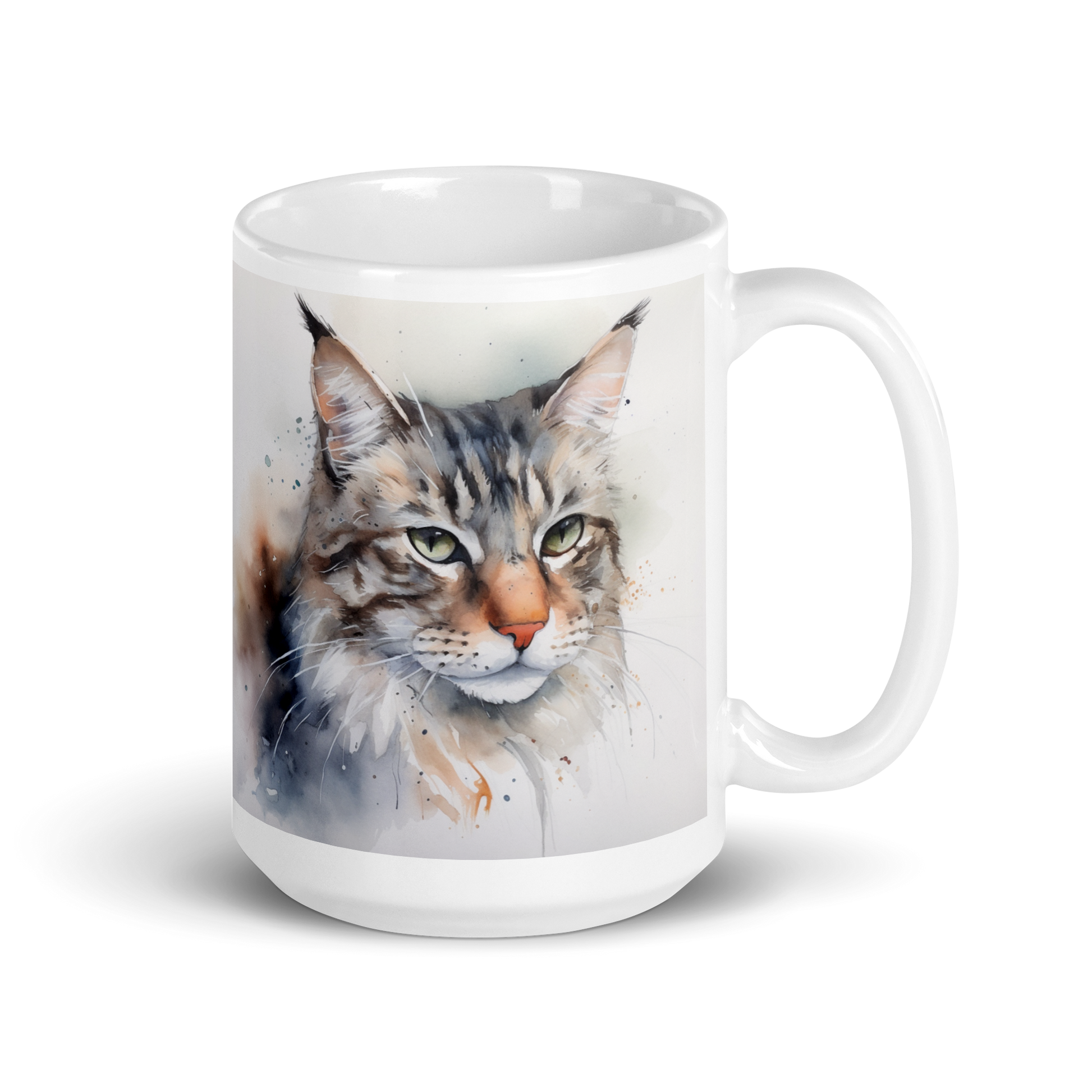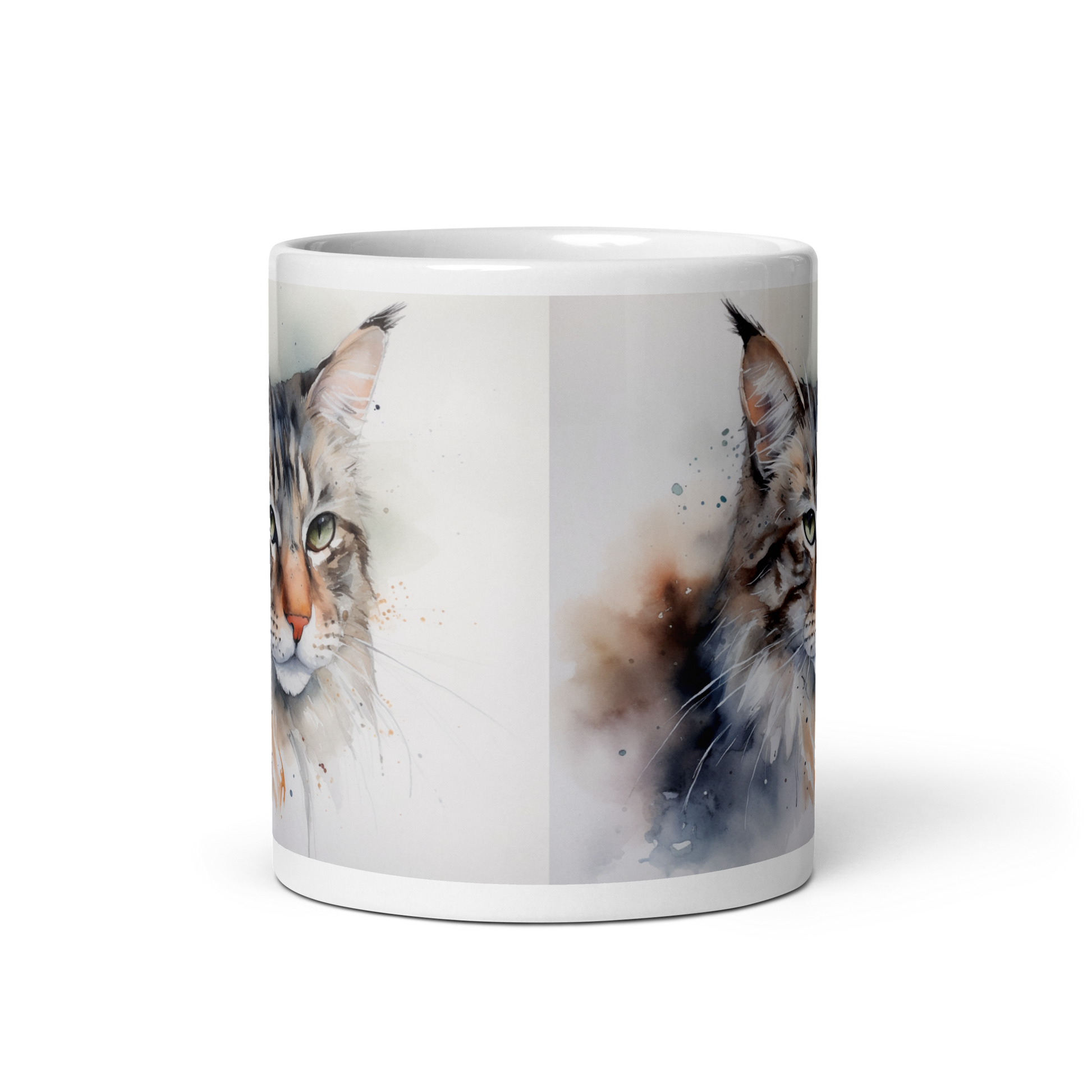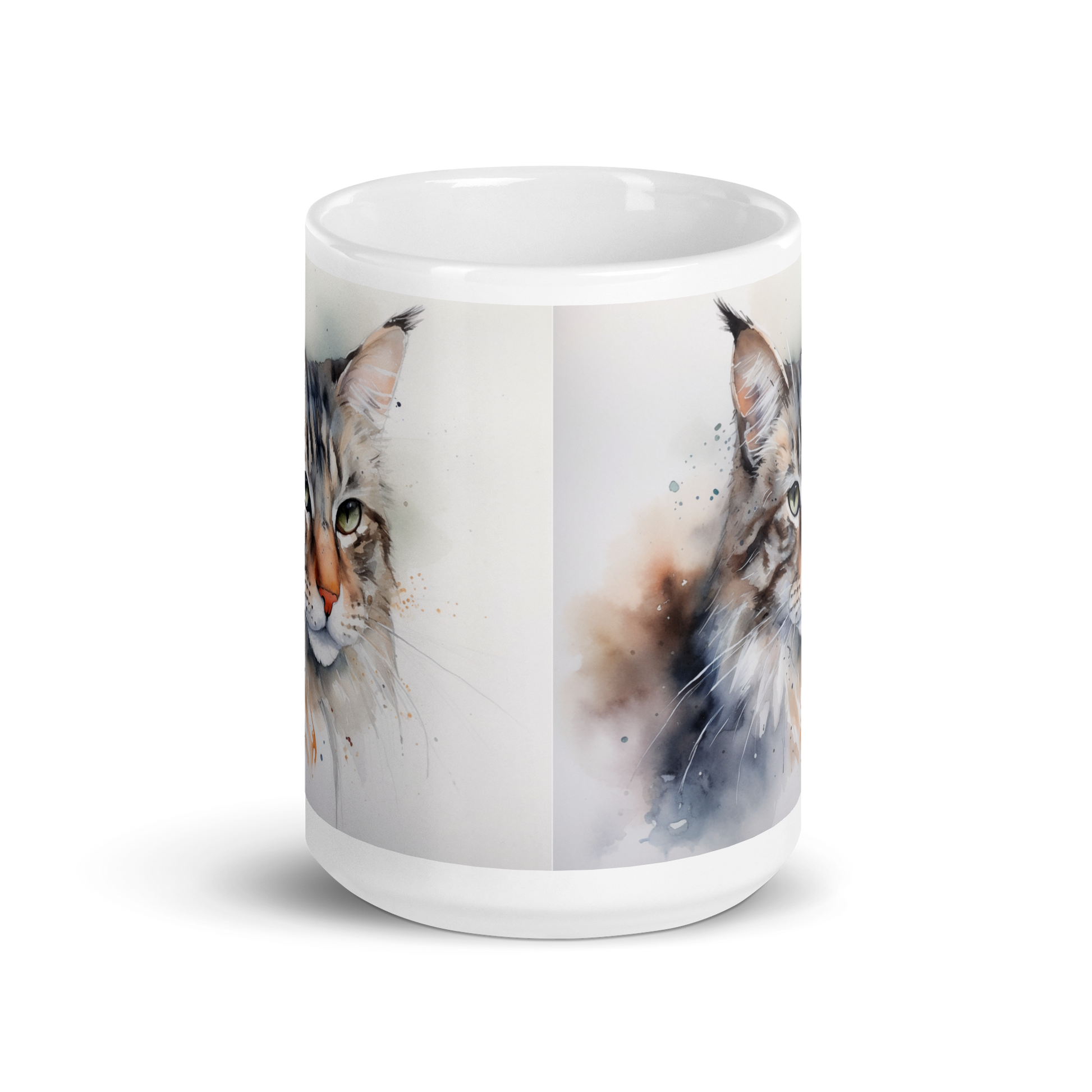 This glossy white mug features a picture of a cat in the style of a watercolour painting