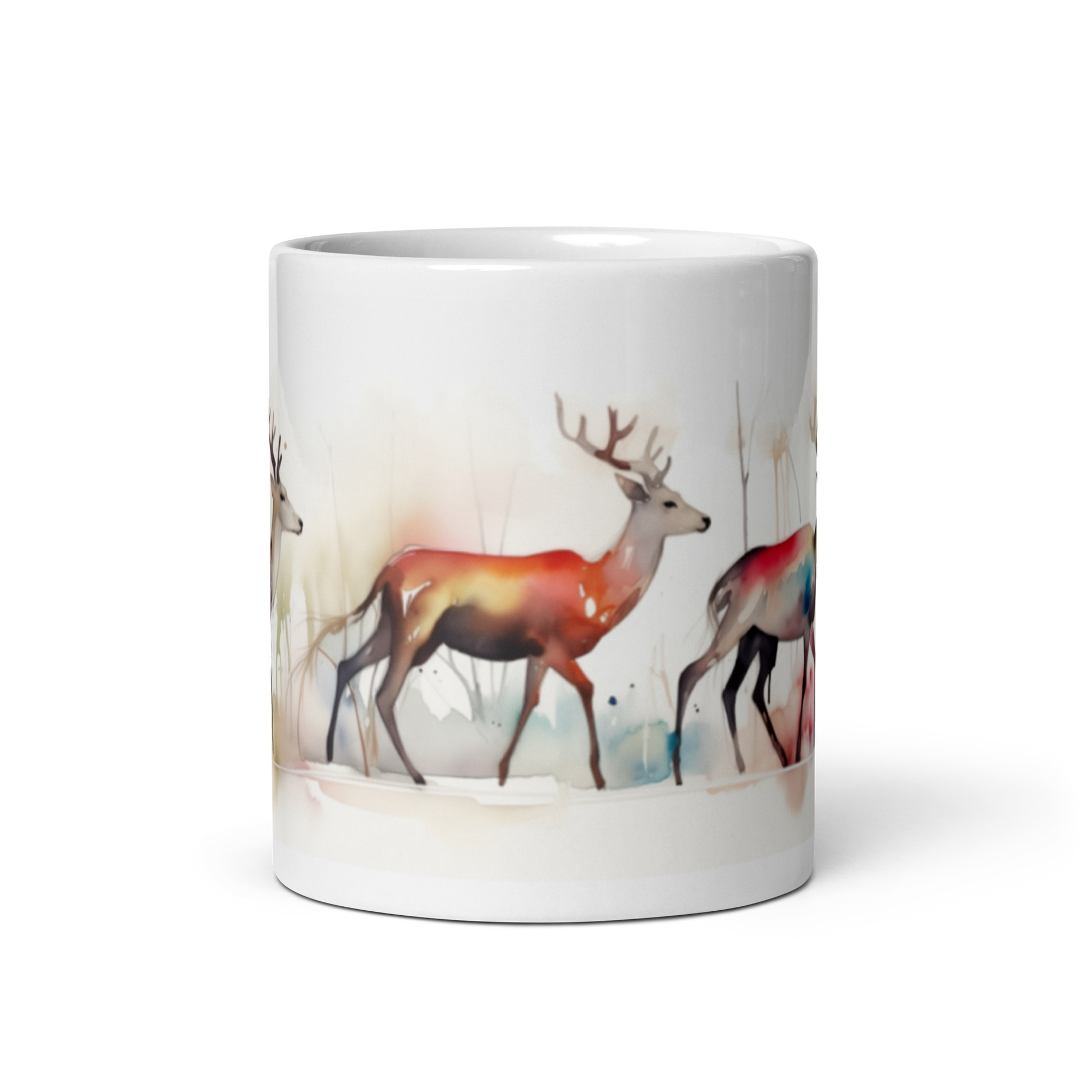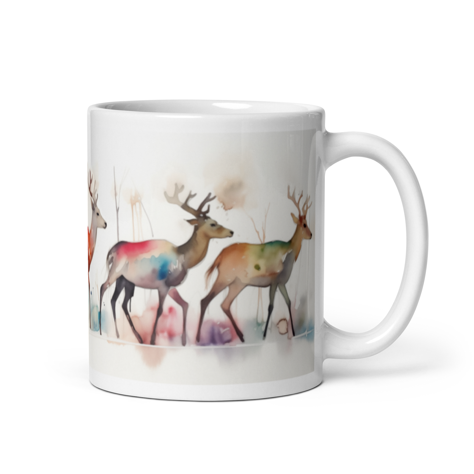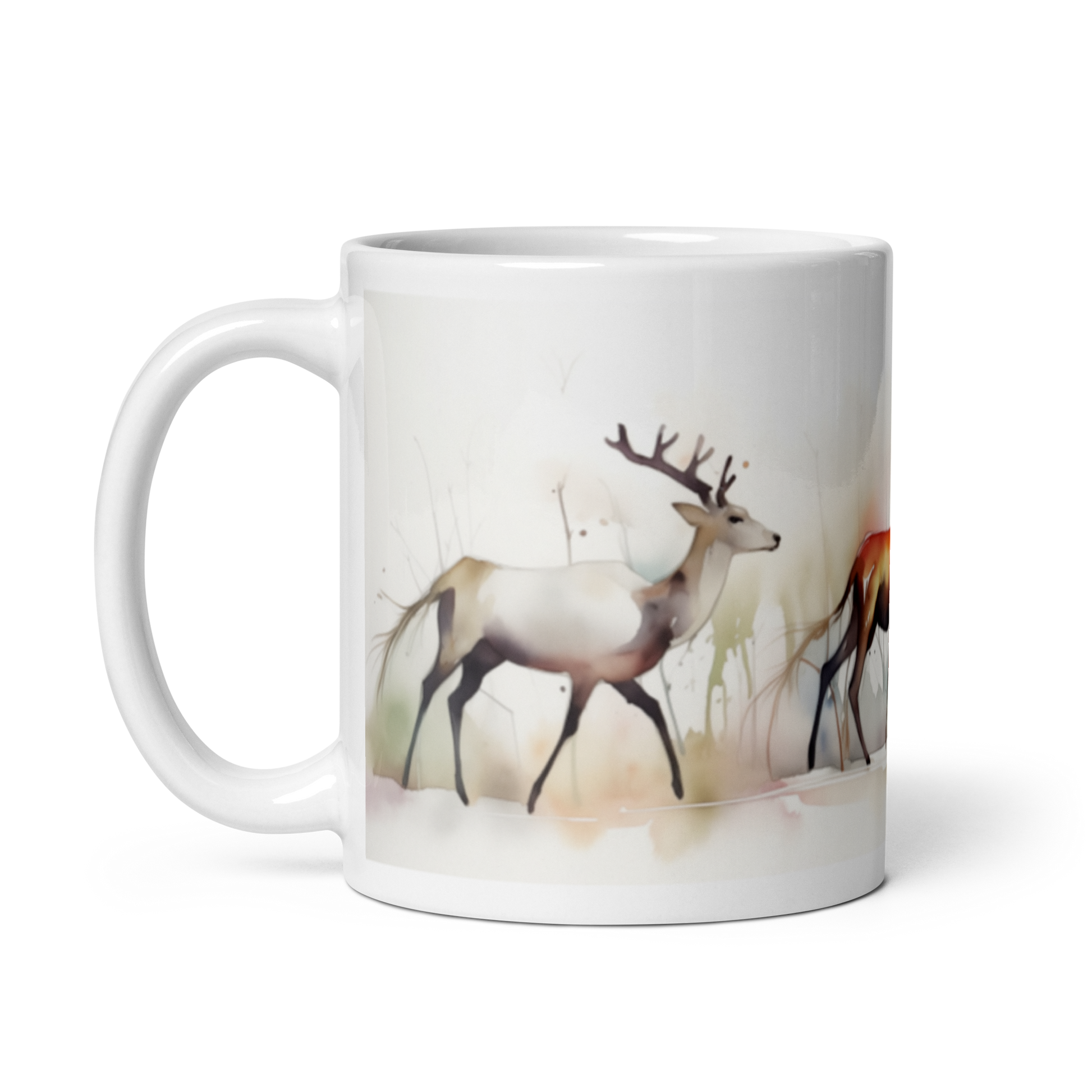 This glossy white mug features a scenic watercolour painting of reindeer wrapped around the side.