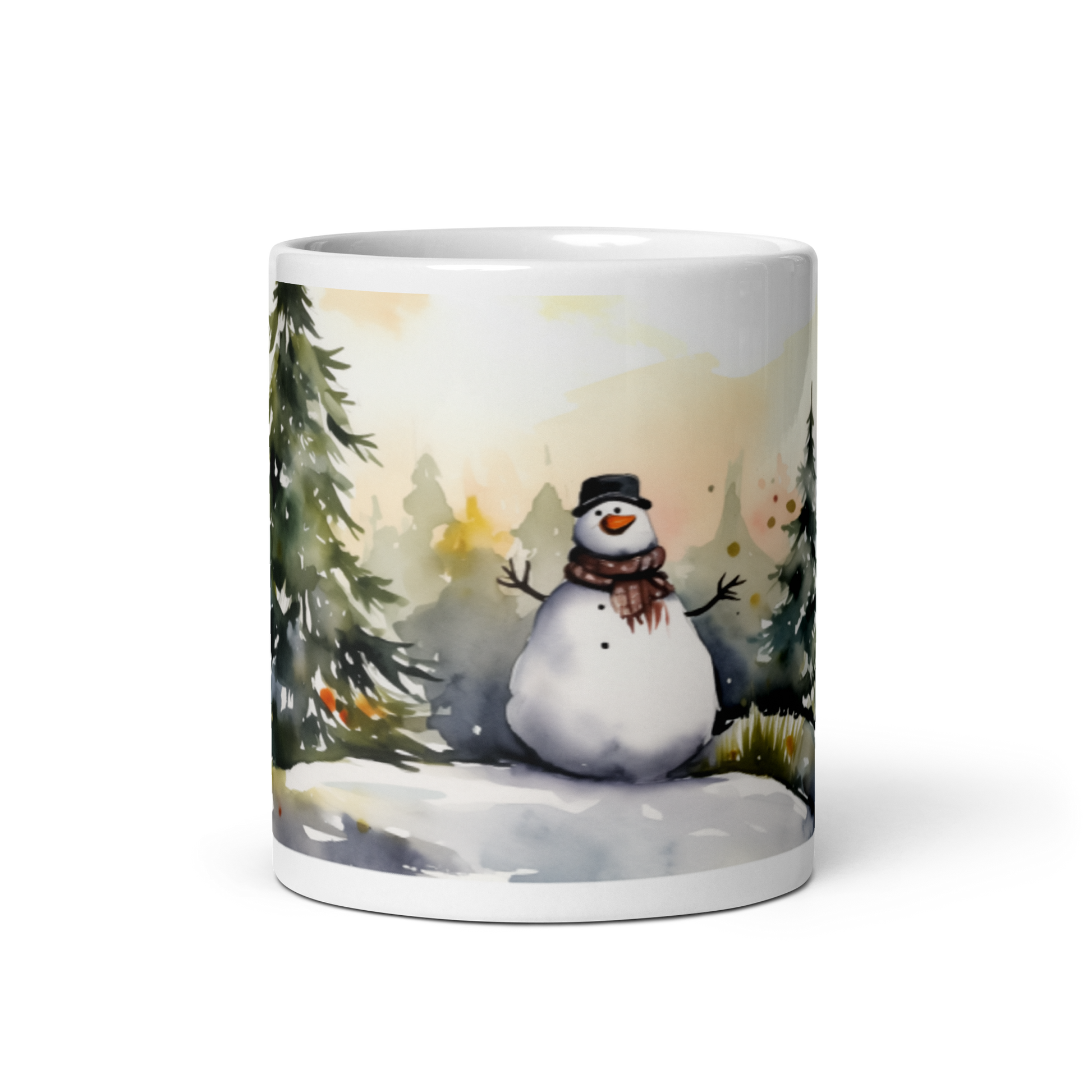 This glossy white mug features a scenic watercolour painting of a snowman wrapped around the side.