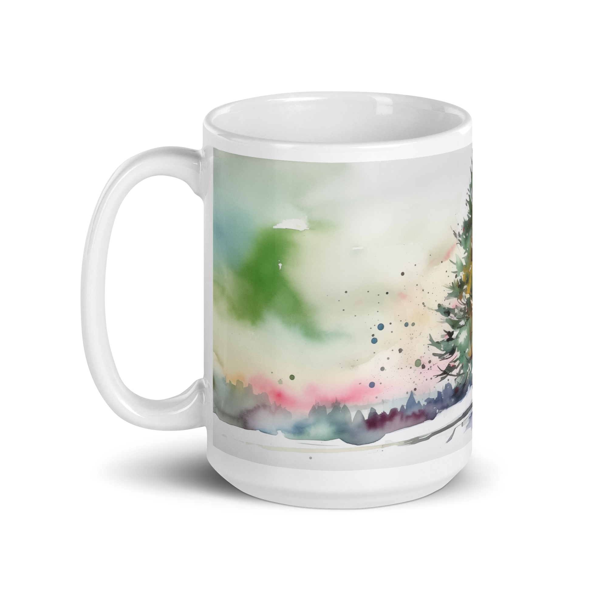 This glossy white mug features a scenic watercolour painting of a colourful winter scene wrapped around the side.
