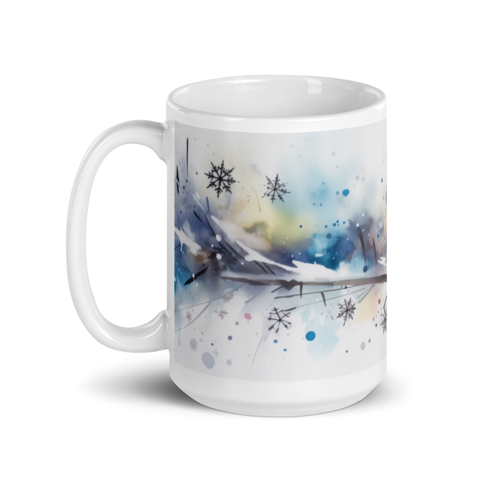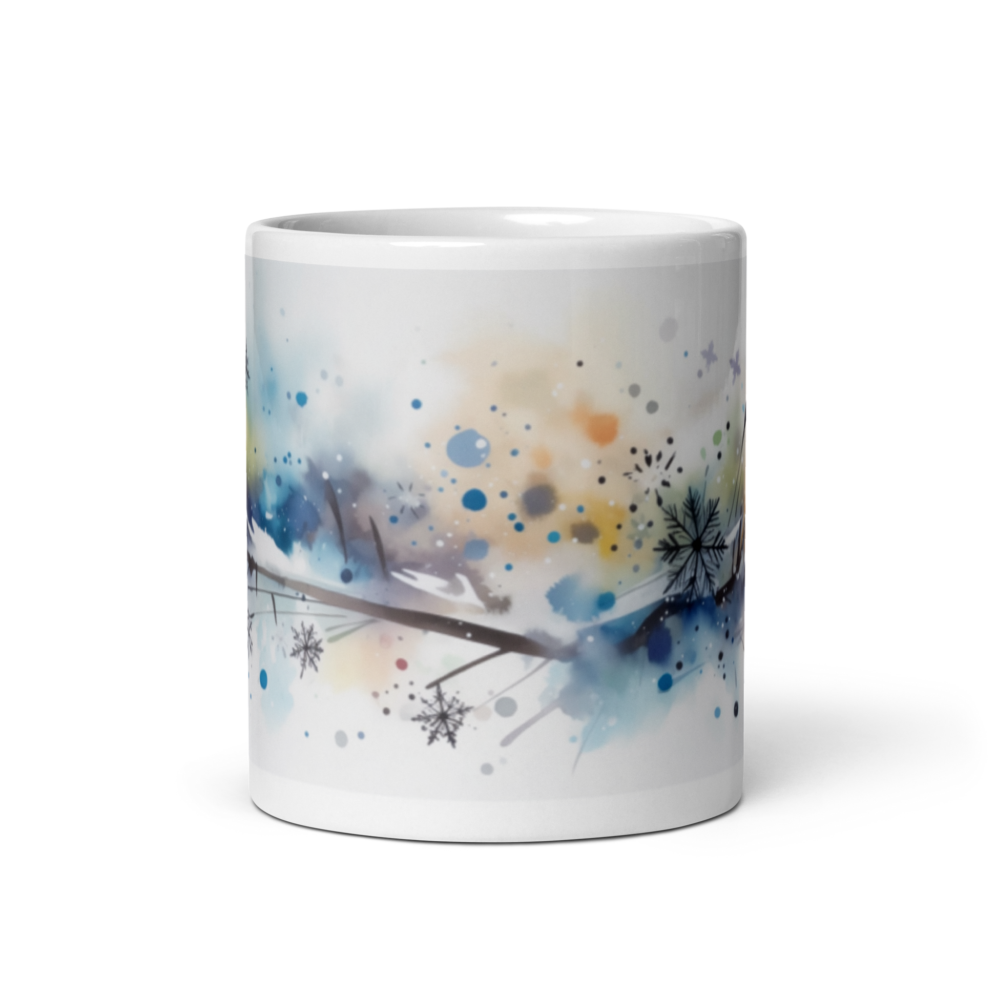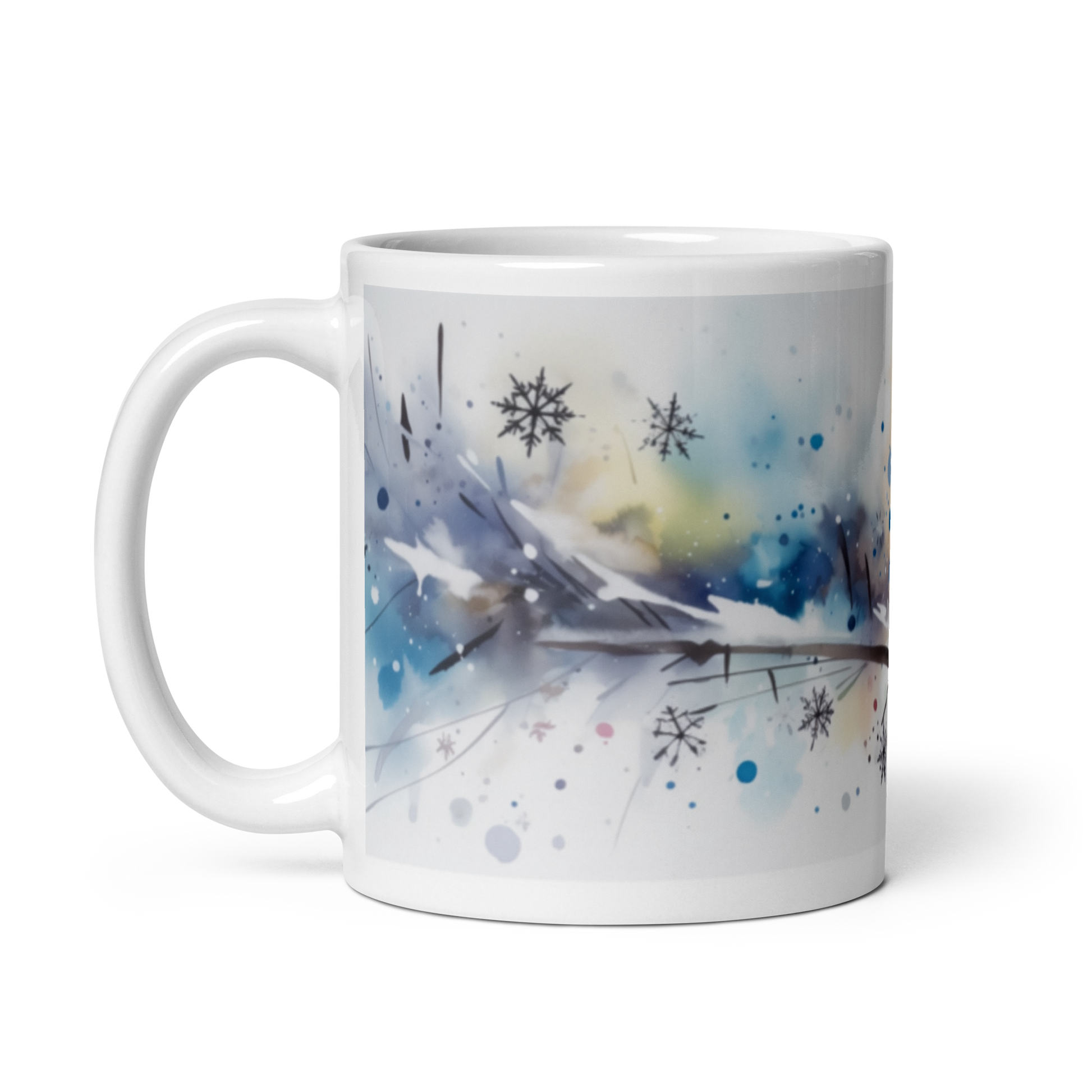 This glossy white mug features a scenic watercolour painting of colourful snowflakes wrapped around the side.
