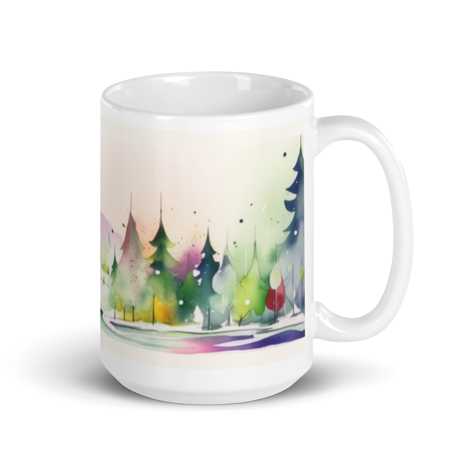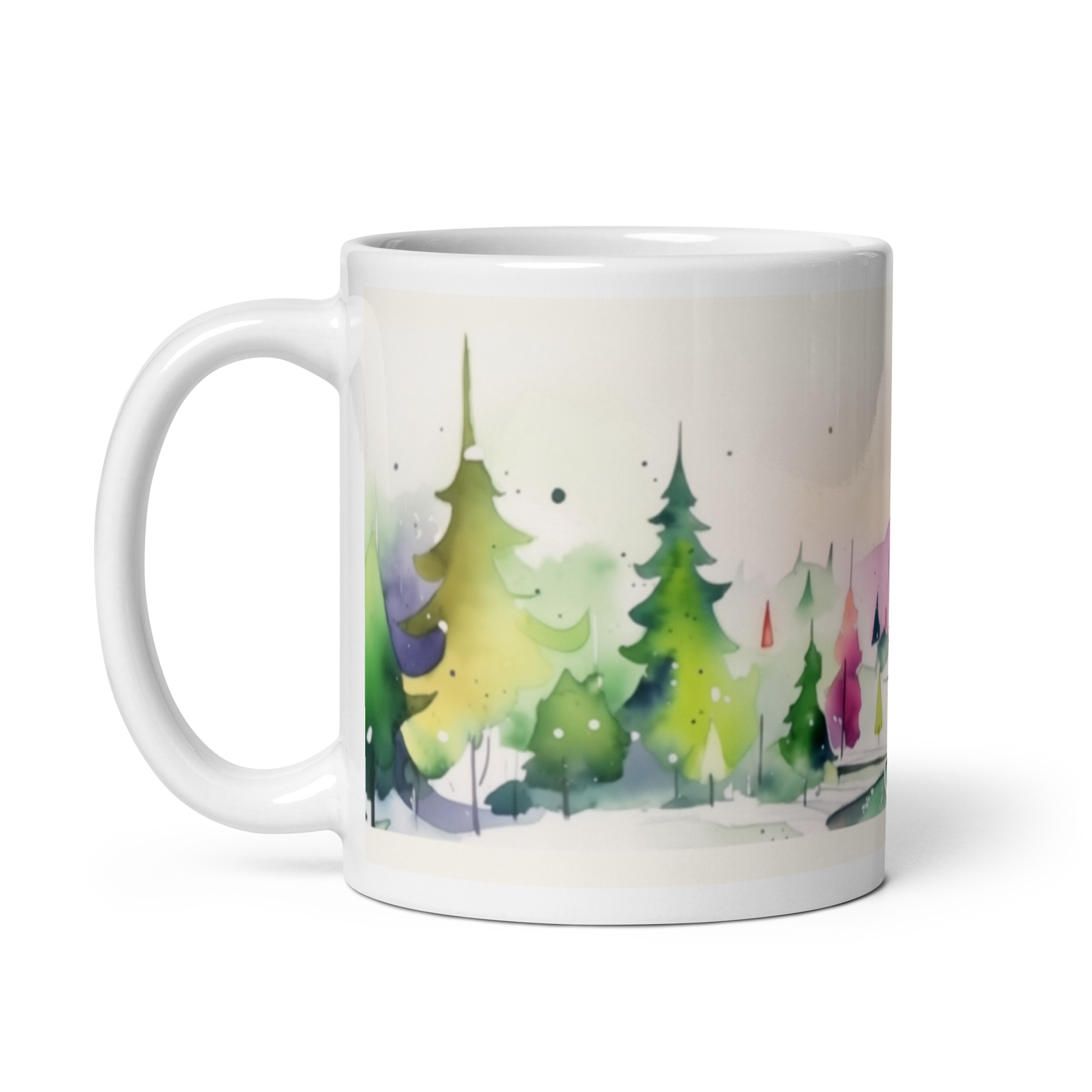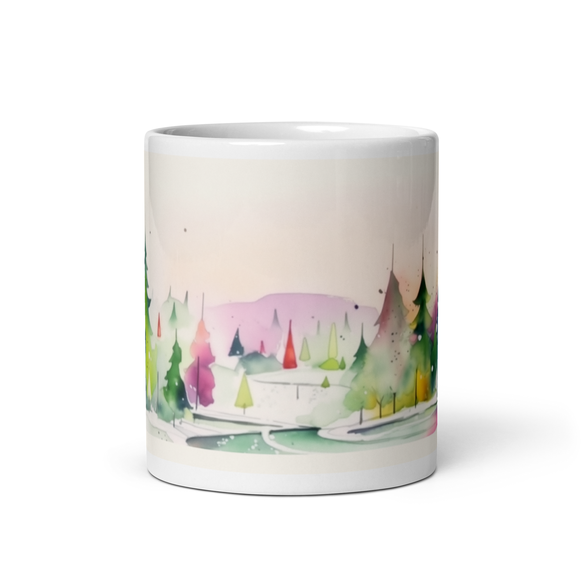 This glossy white mug features a scenic watercolour painting of a colourful winter scene wrapped around the side.