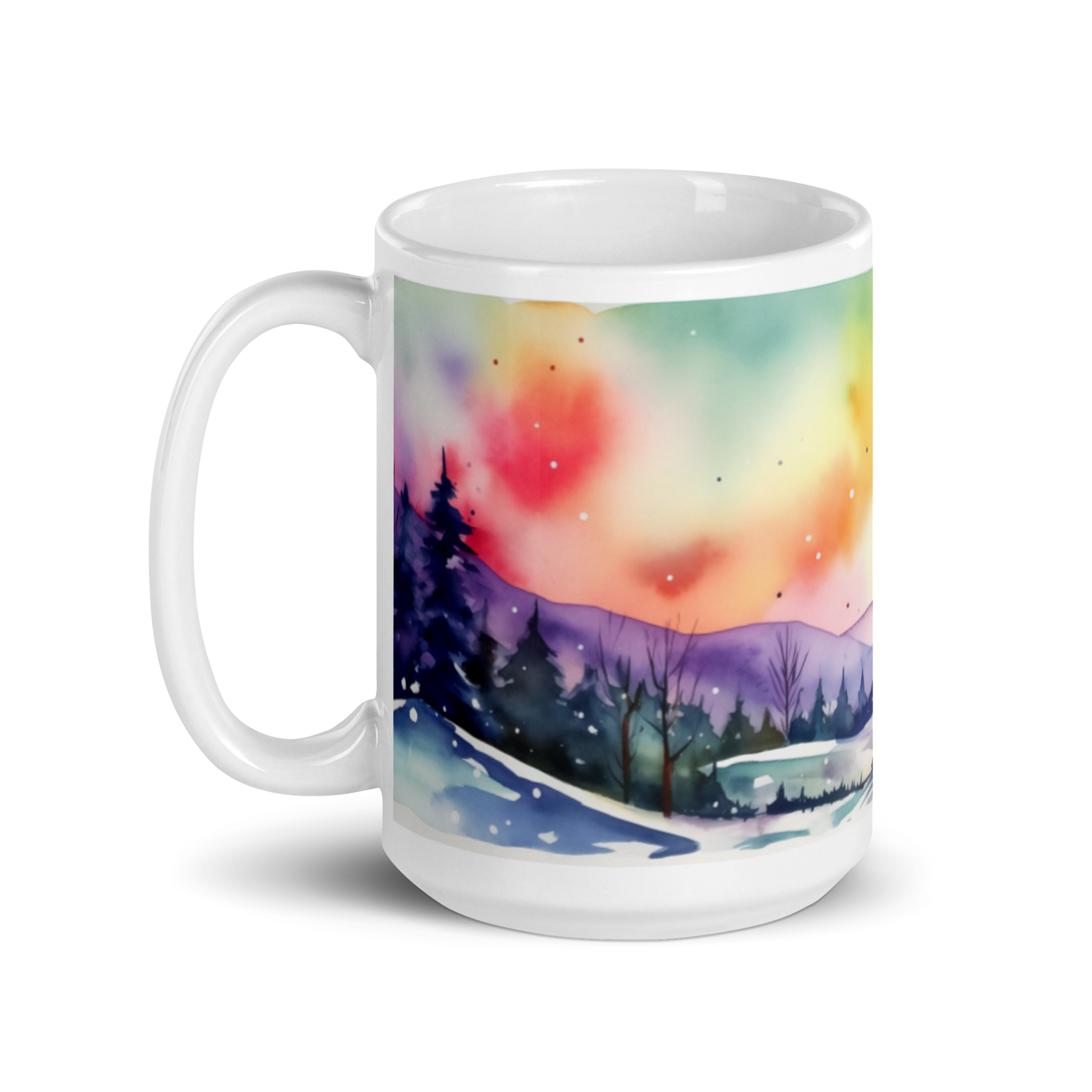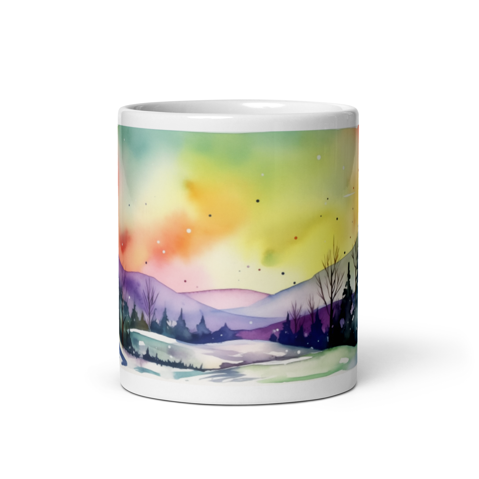 This glossy white mug features a scenic watercolour painting of a colourful winter scene wrapped around the side.
