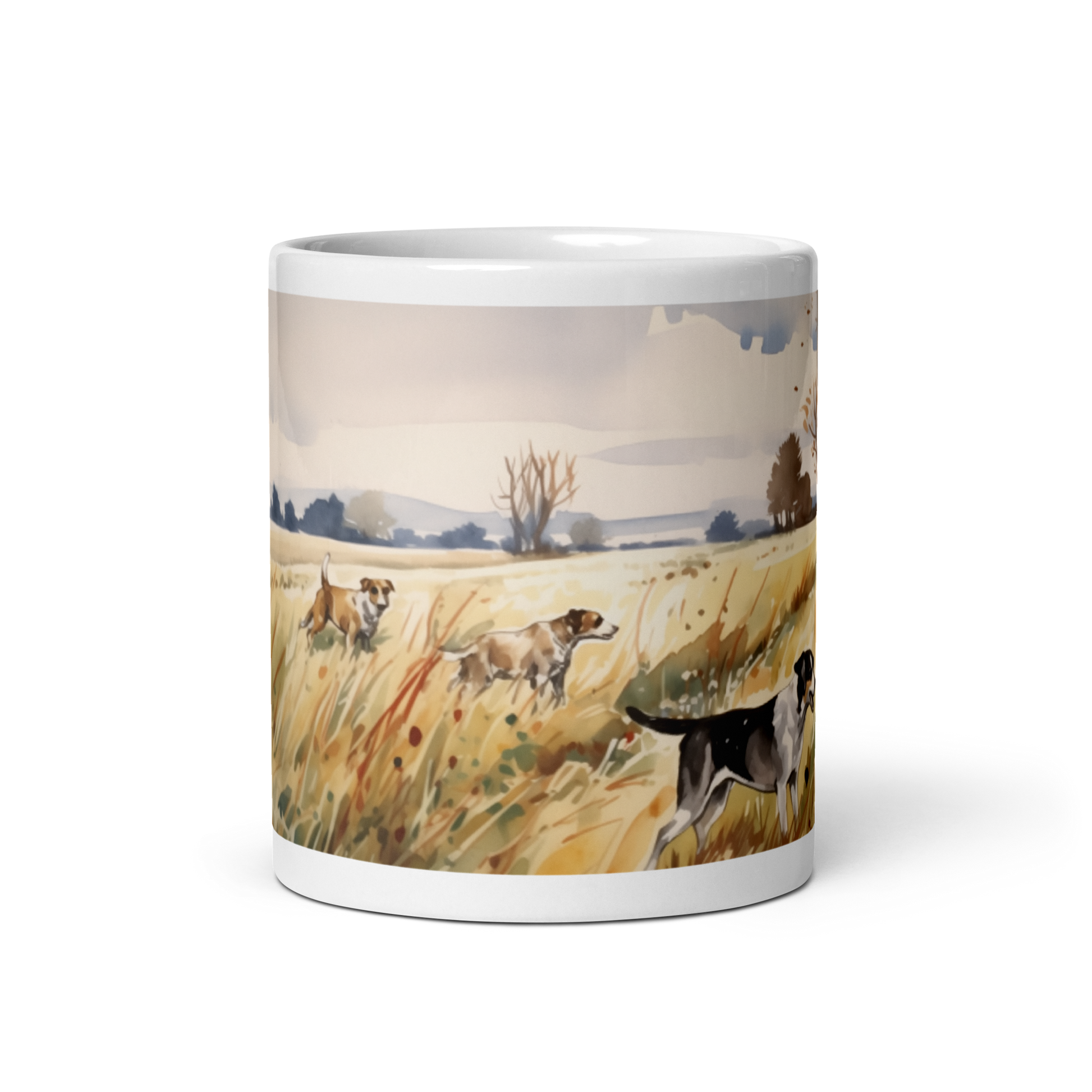 This glossy white mug features a watercolour painting of Dogs in a field wrapped around the side.