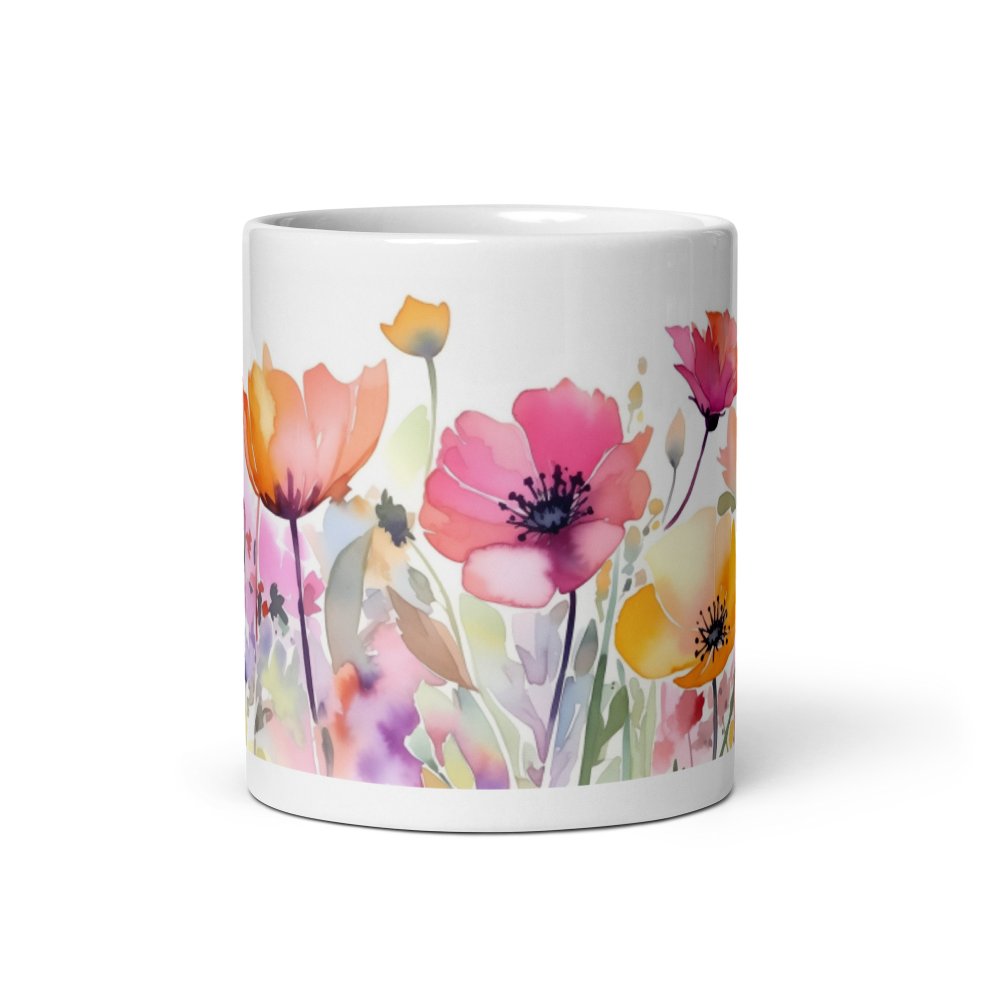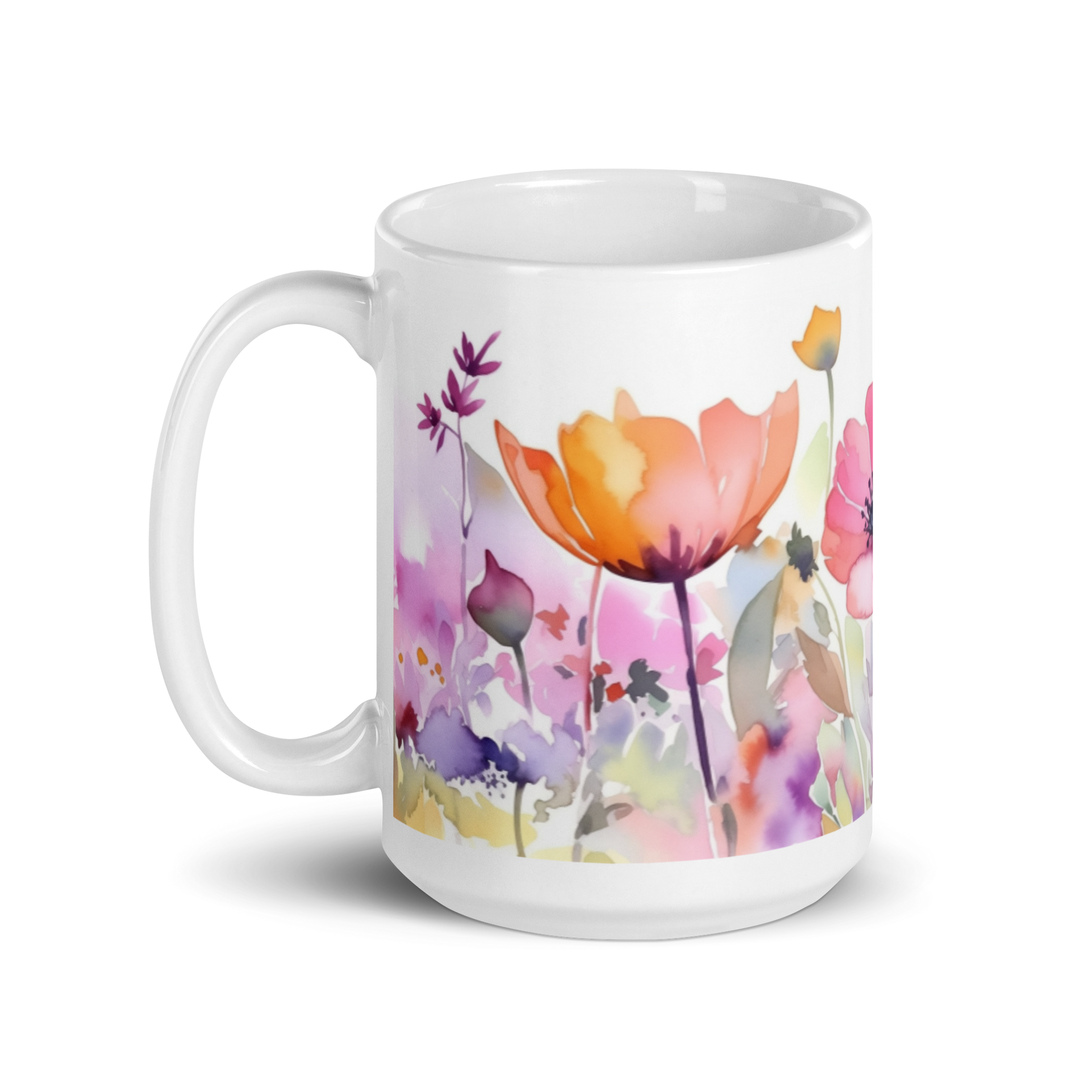 This glossy white mug features a watercolour painting of some flowers wrapped around the side.
