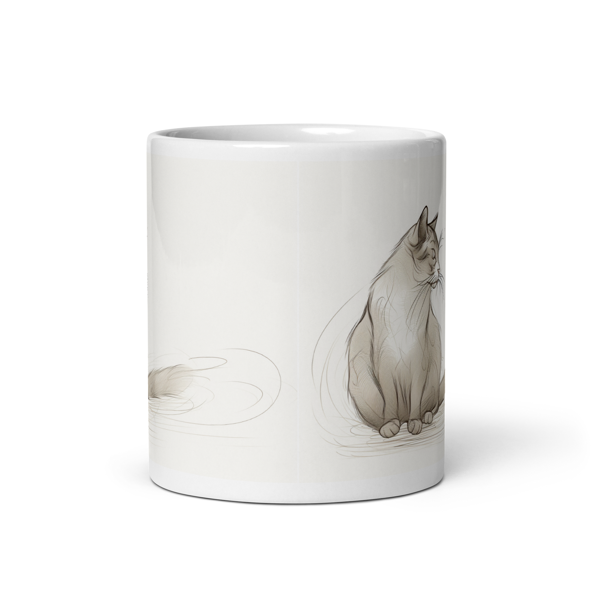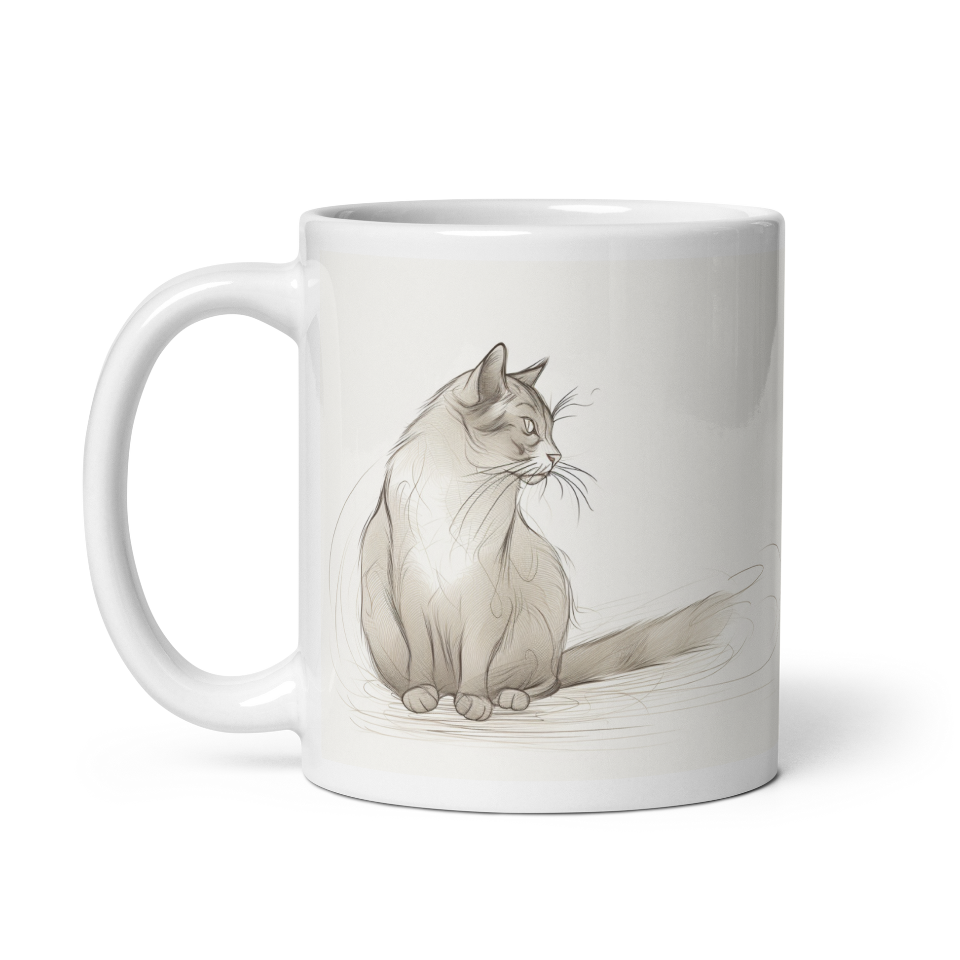 This glossy white mug features a cat in the style of a pencil sketch on both sides.