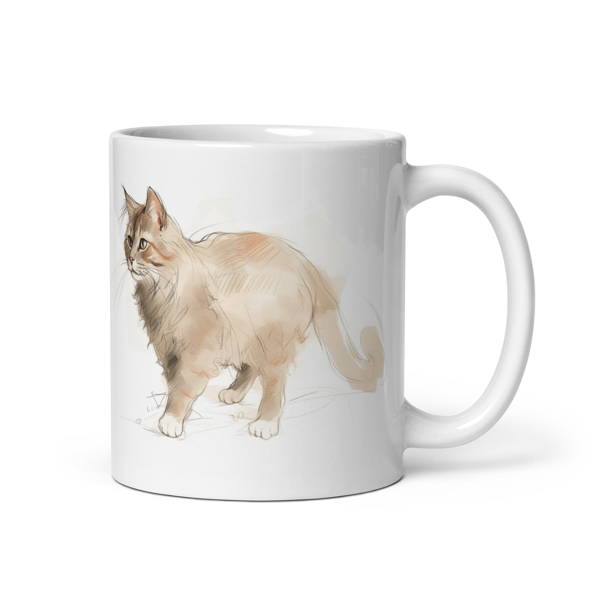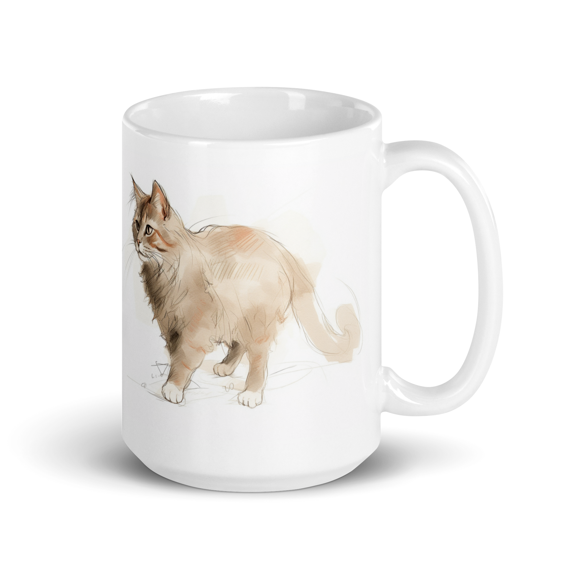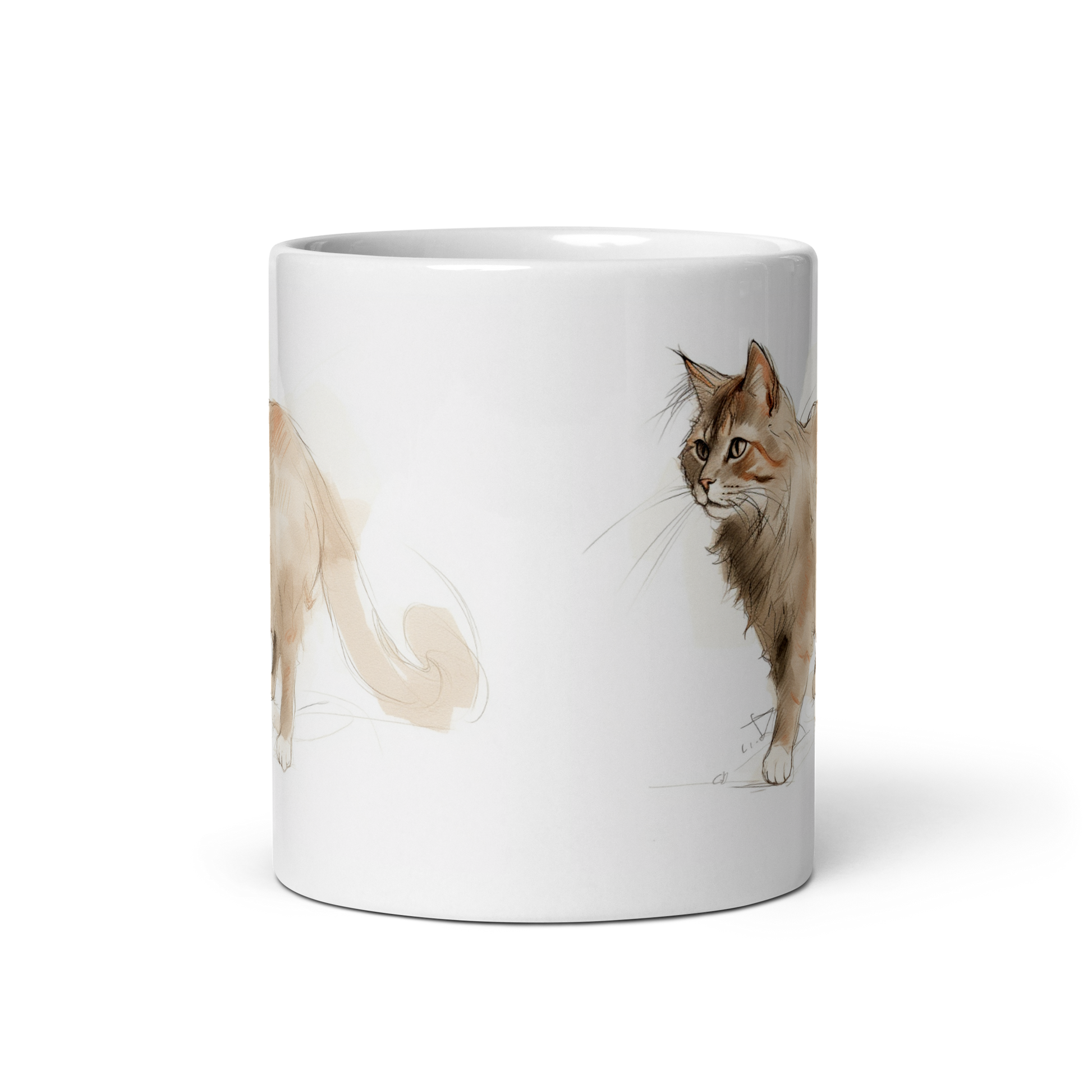 This glossy white mug features a cat in the style of a pencil sketch on both sides.