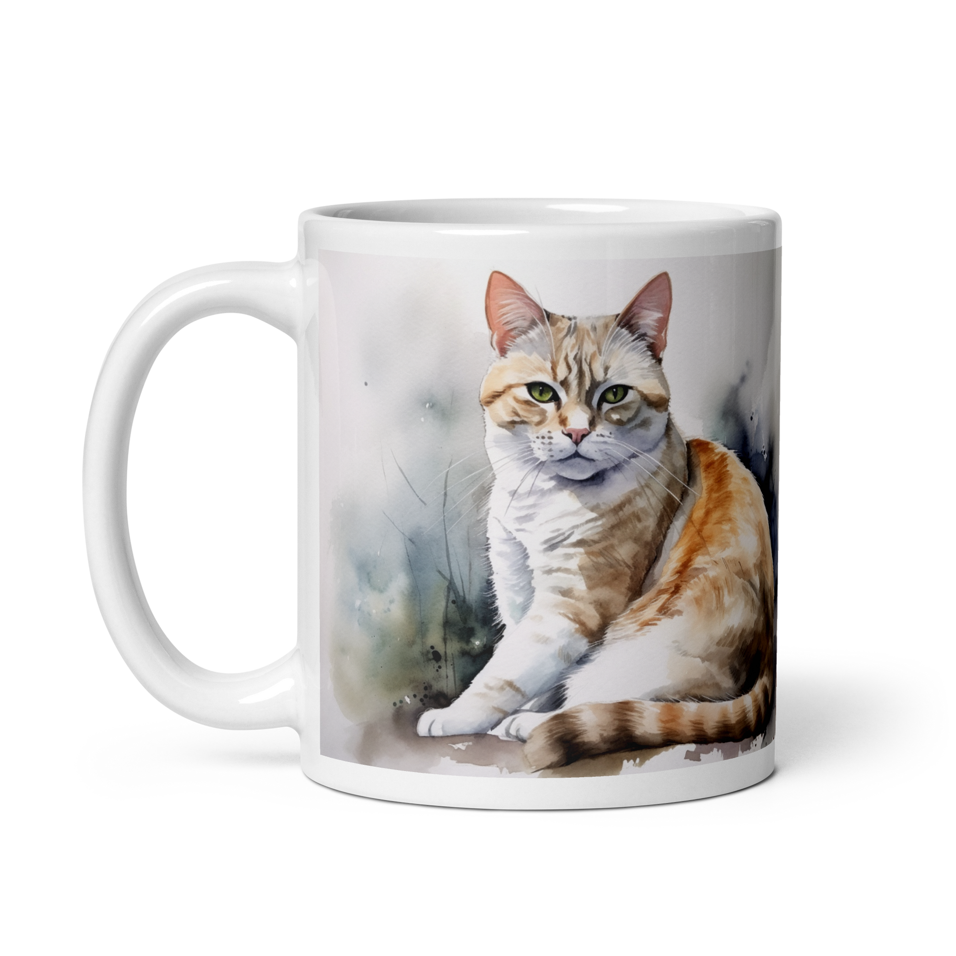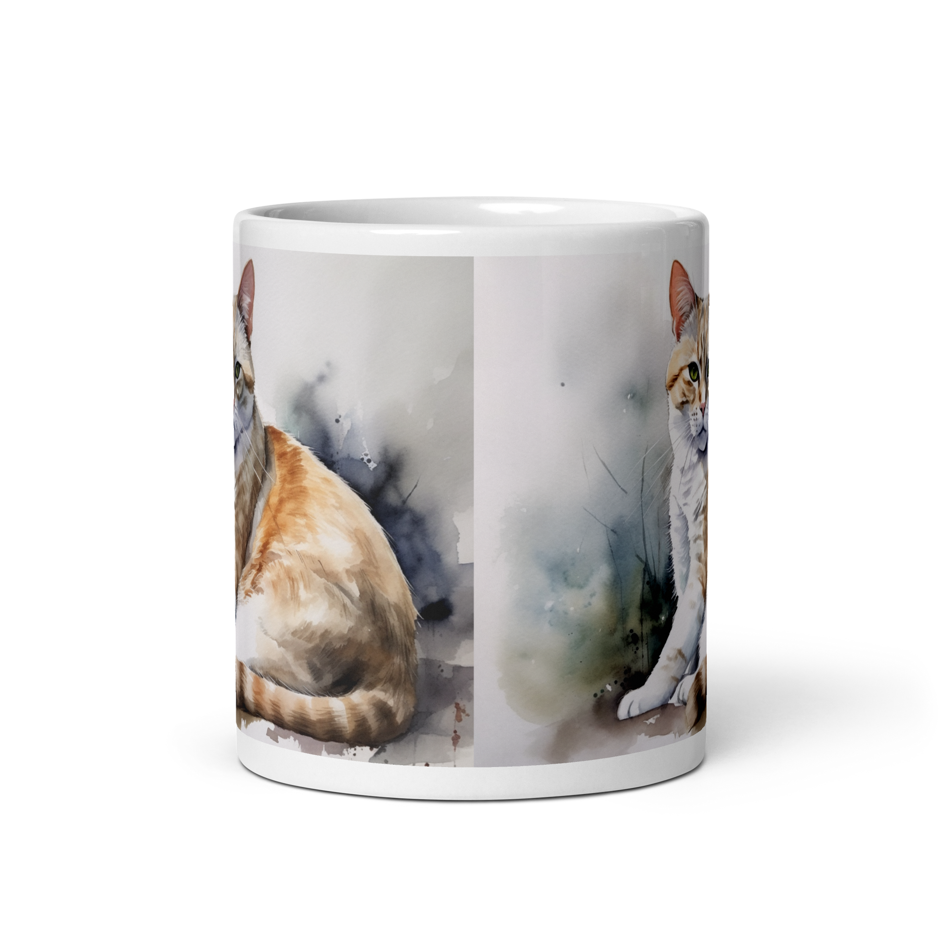 This glossy white mug features a picture of a cat in the style of a watercolour painting