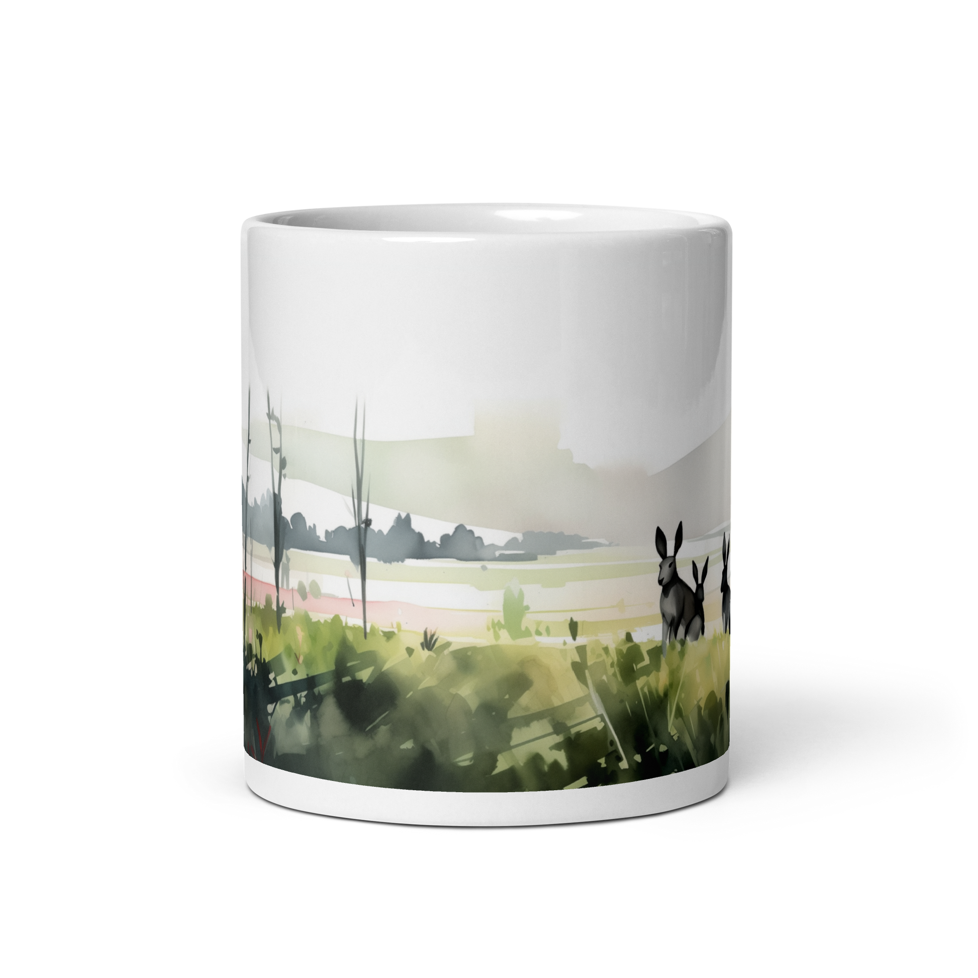 This glossy white mug features a watercolour painting bunnies in a field wrapped around the side.