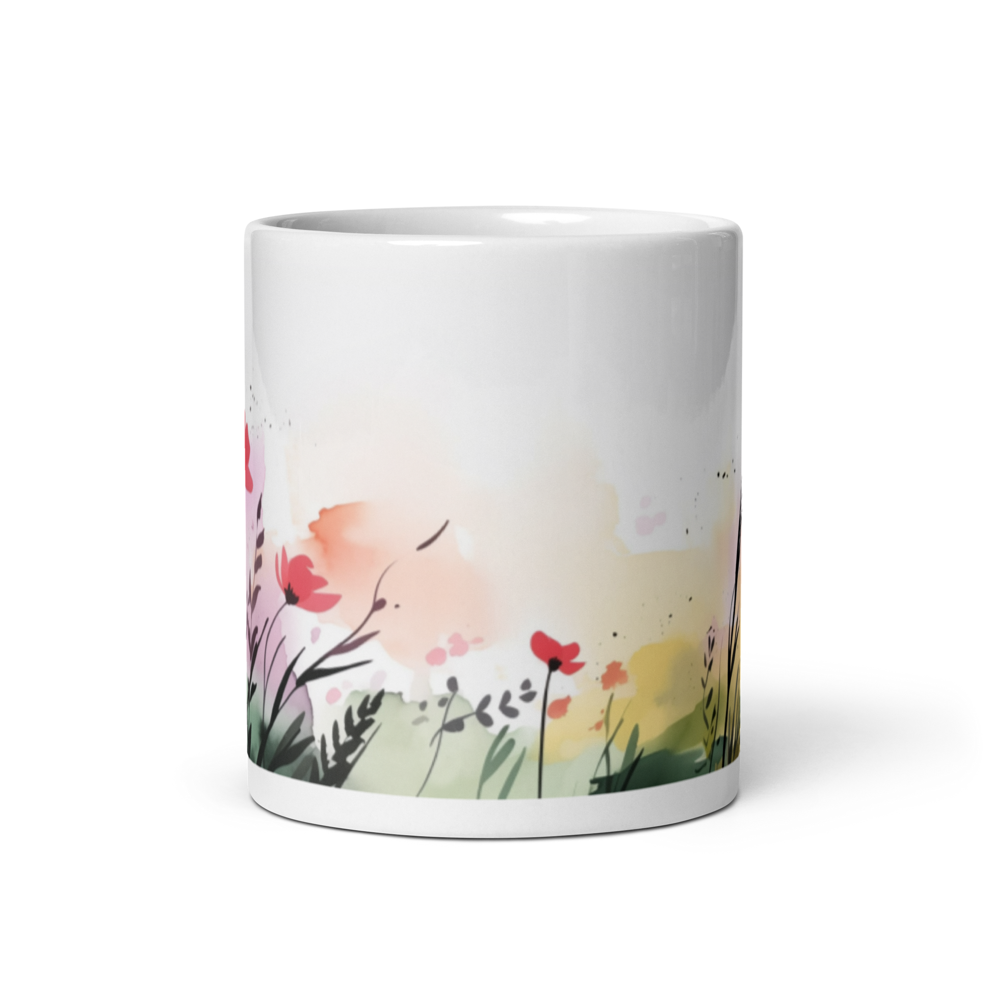 This glossy white mug features a watercolour painting of some flowers wrapped around the side.