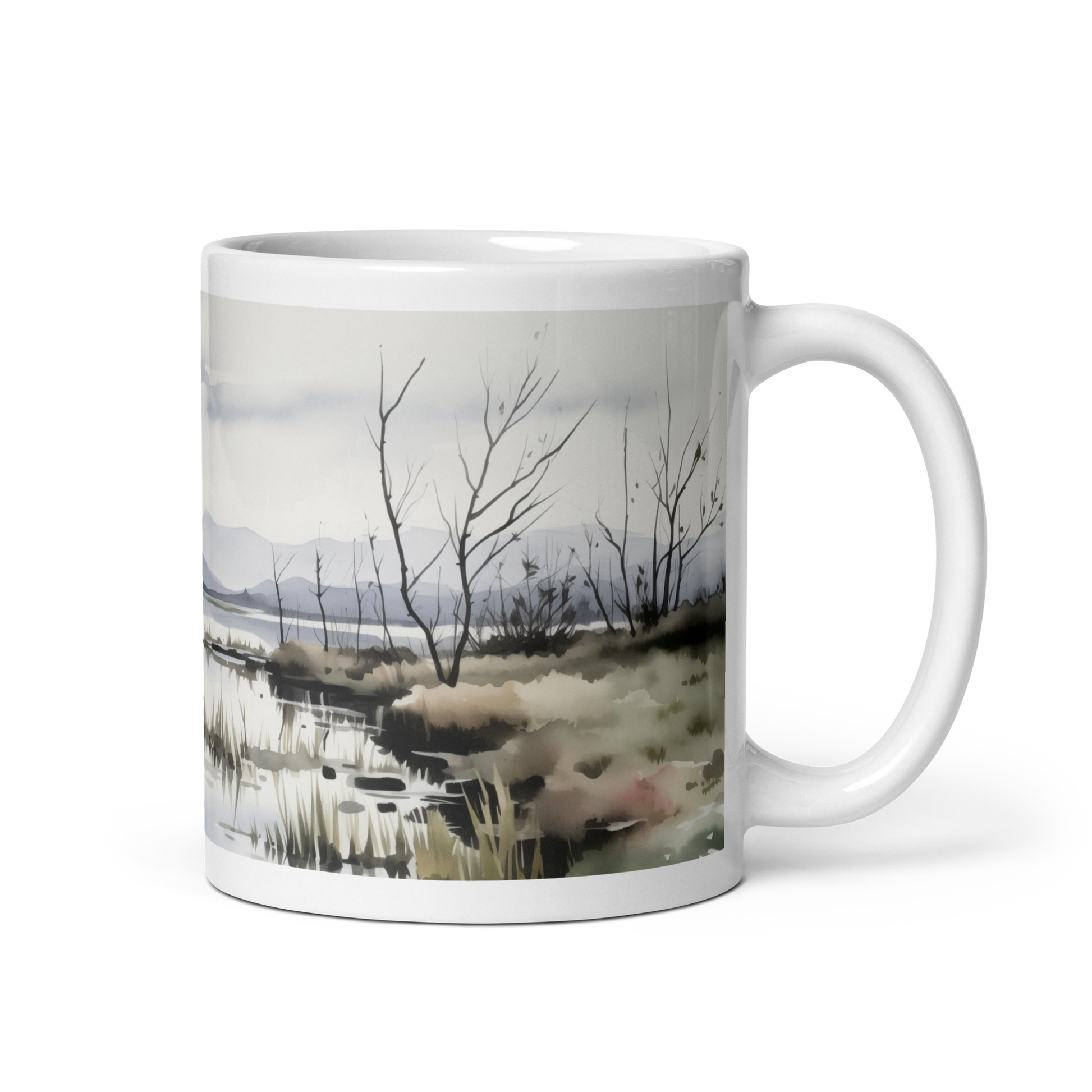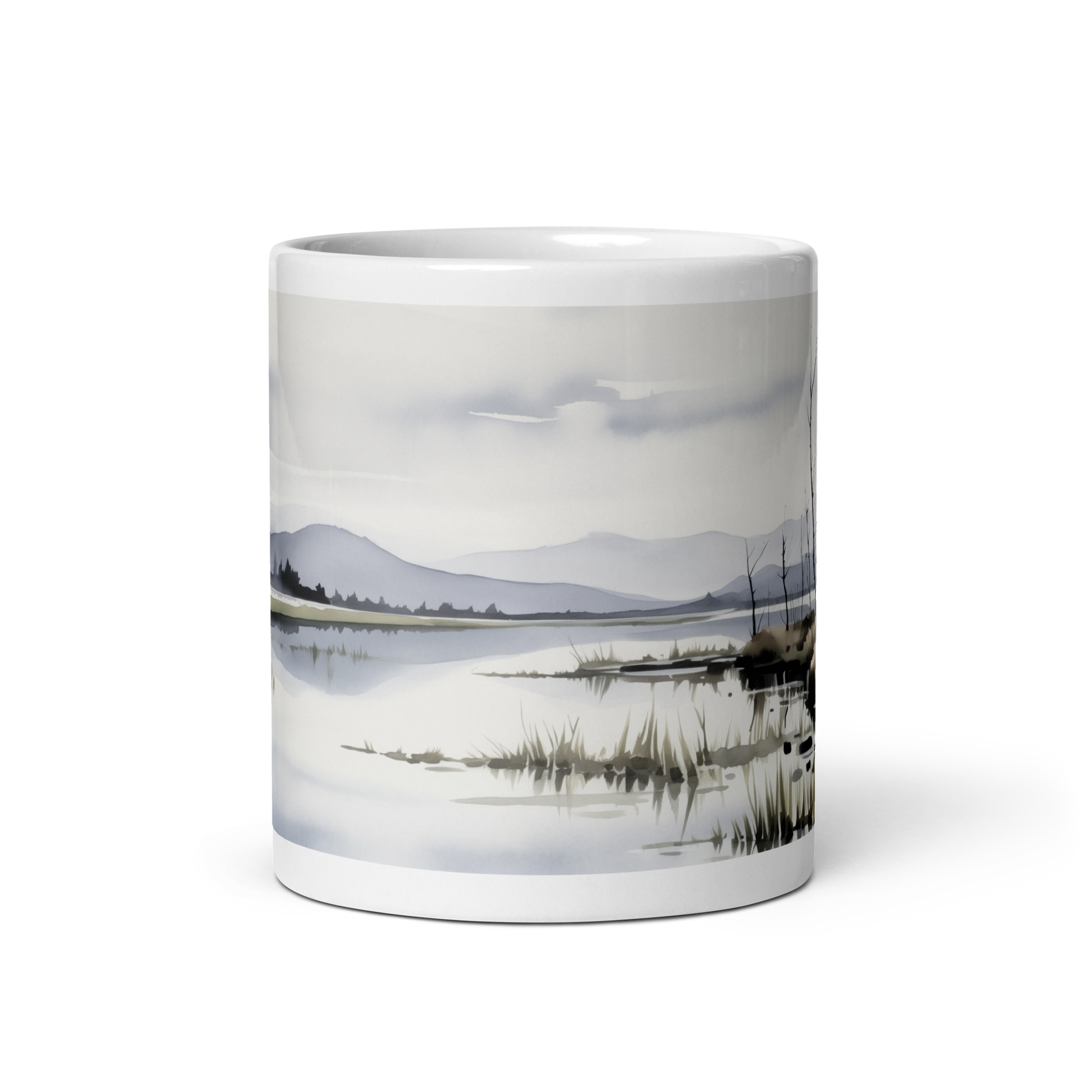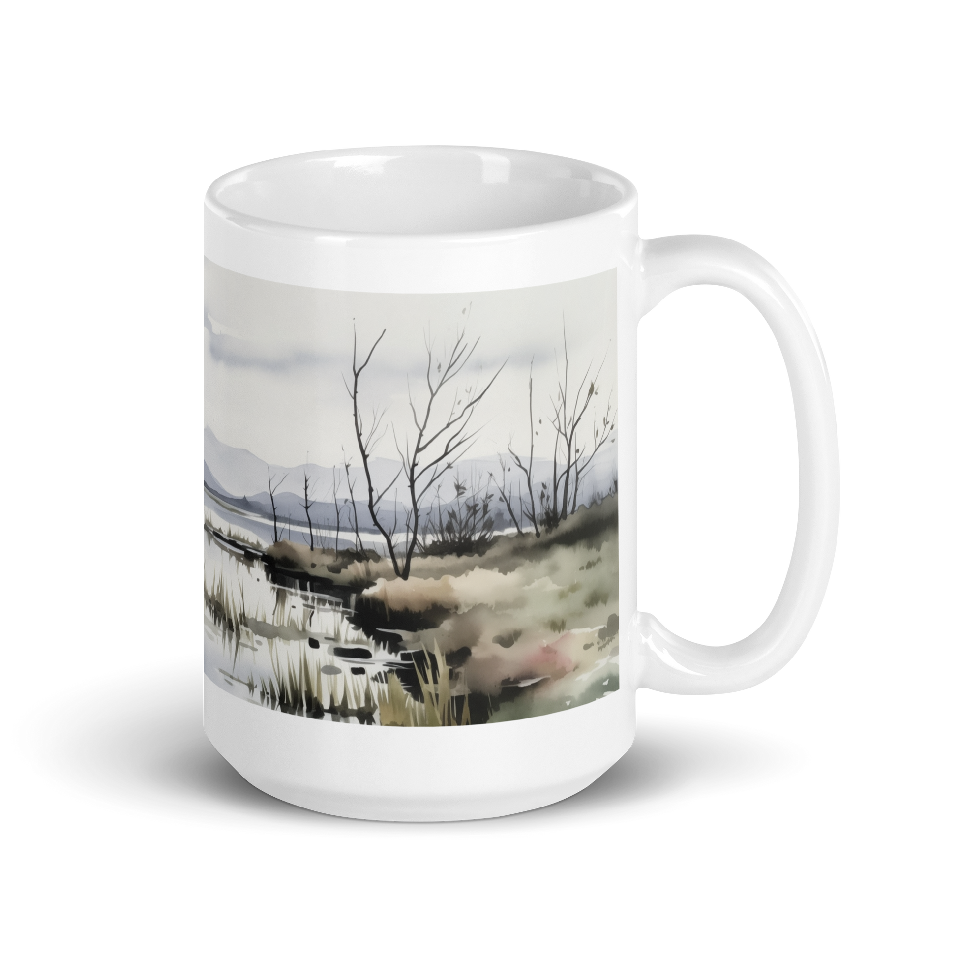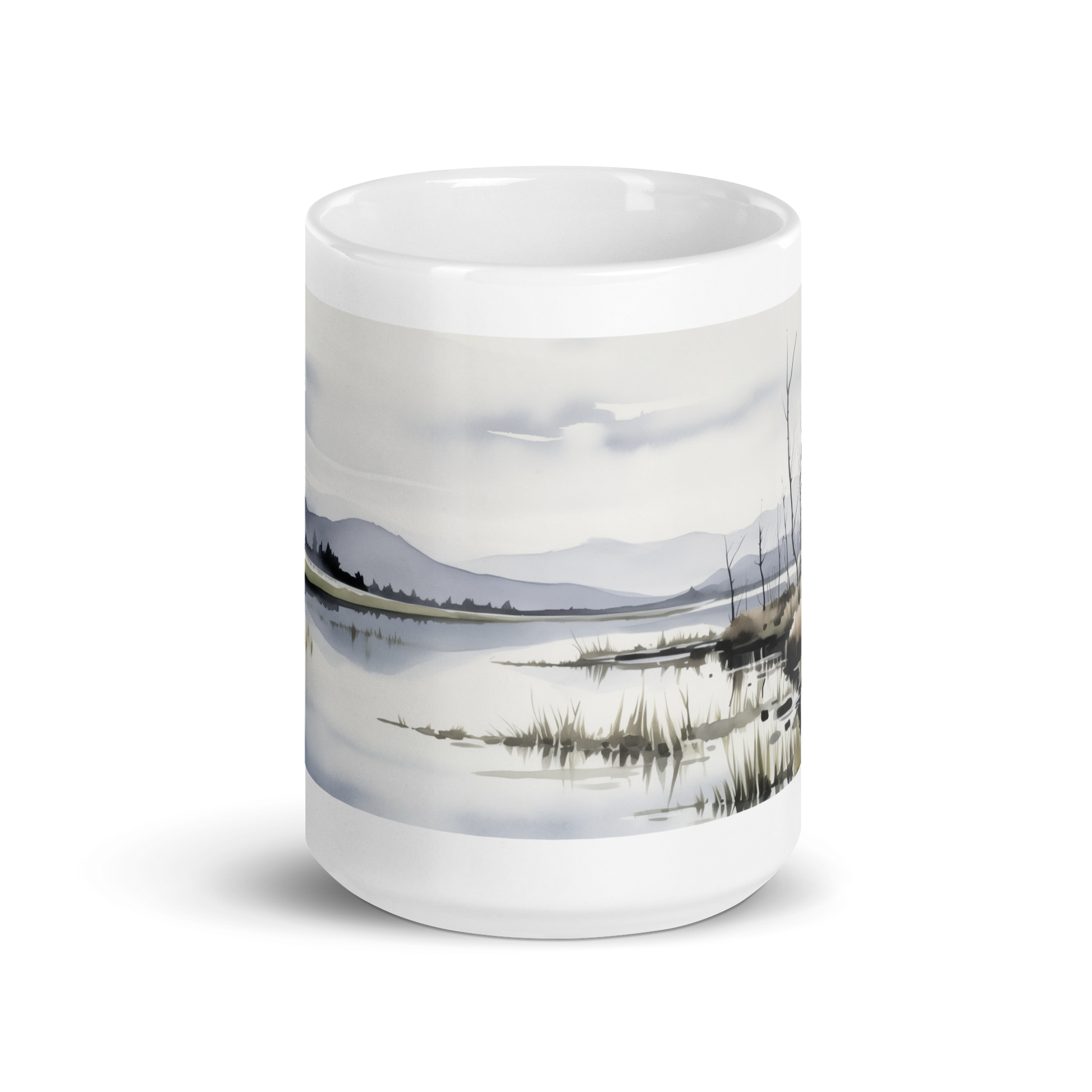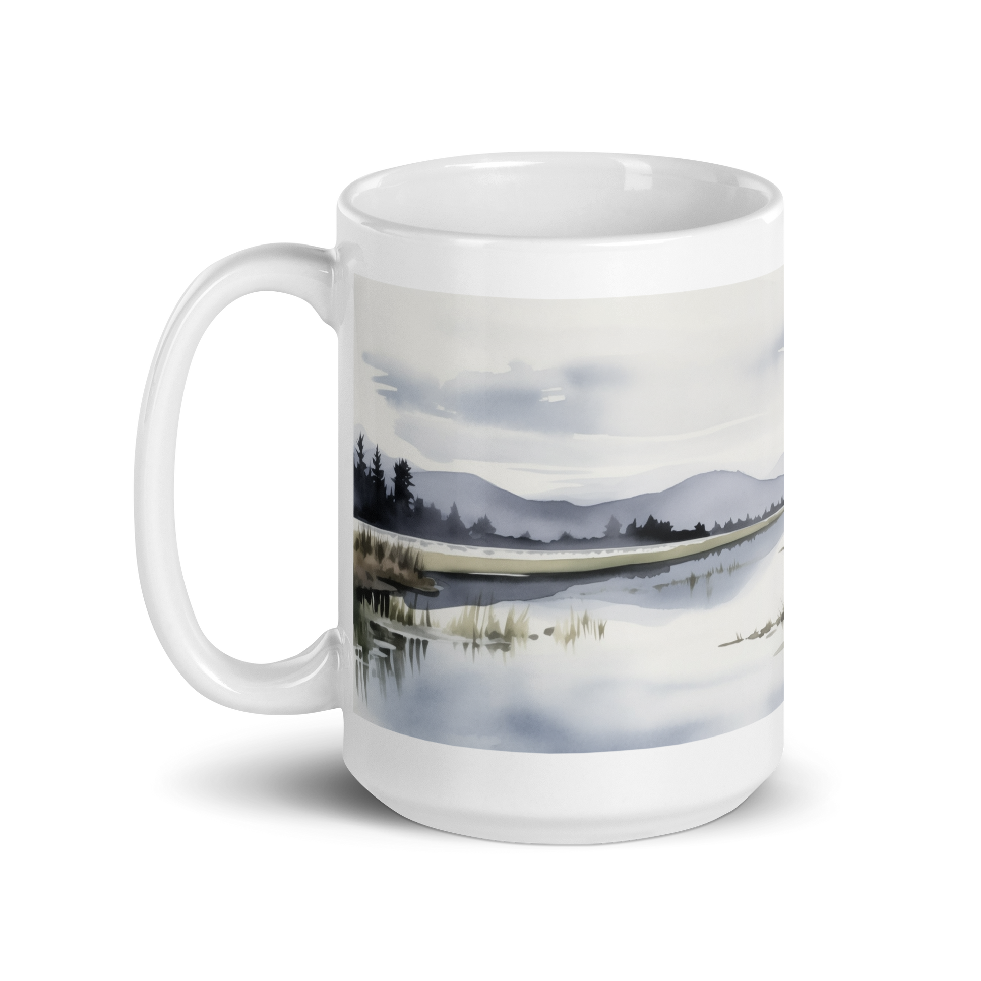 This glossy white mug features a scenic watercolour painting of a lake wrapped around the side.