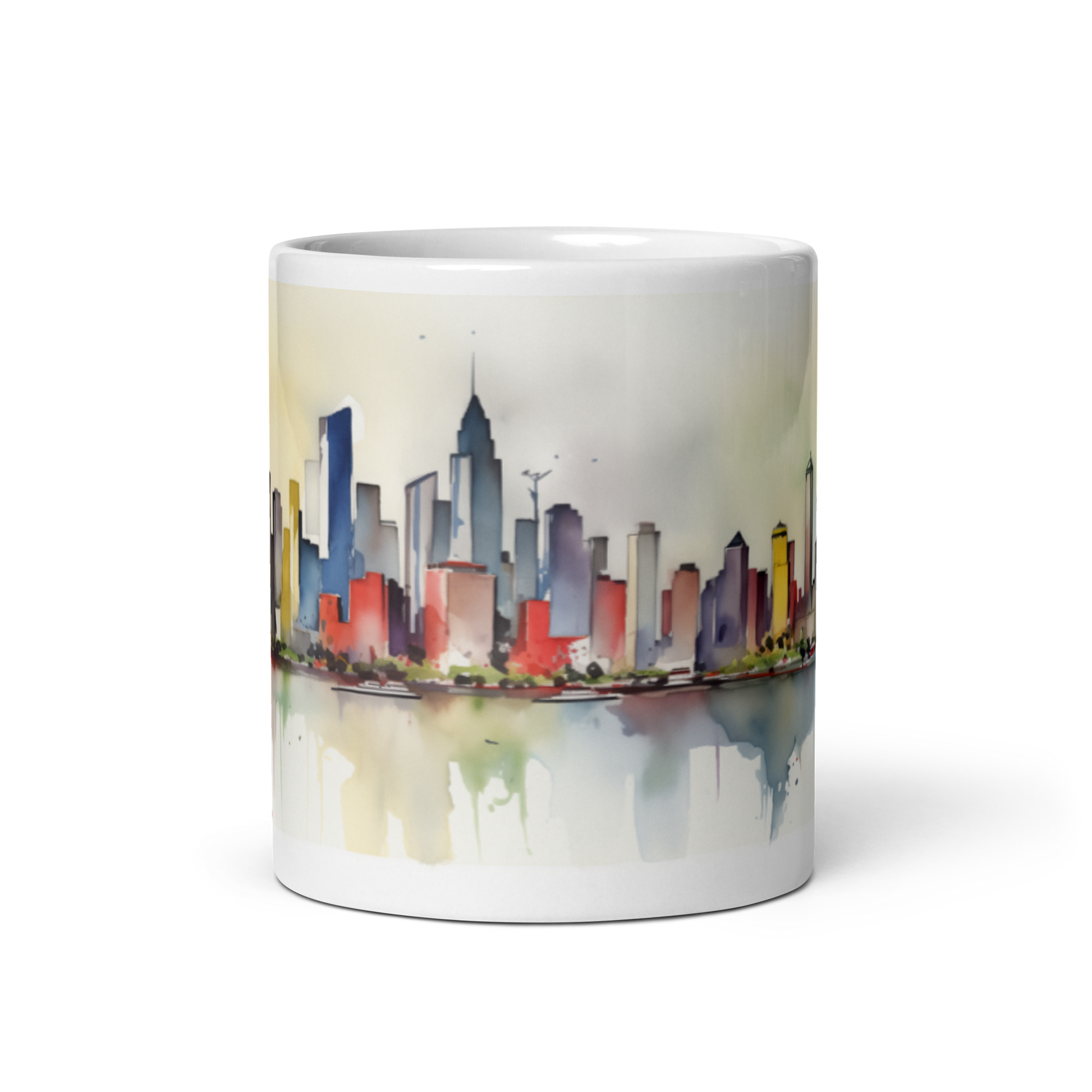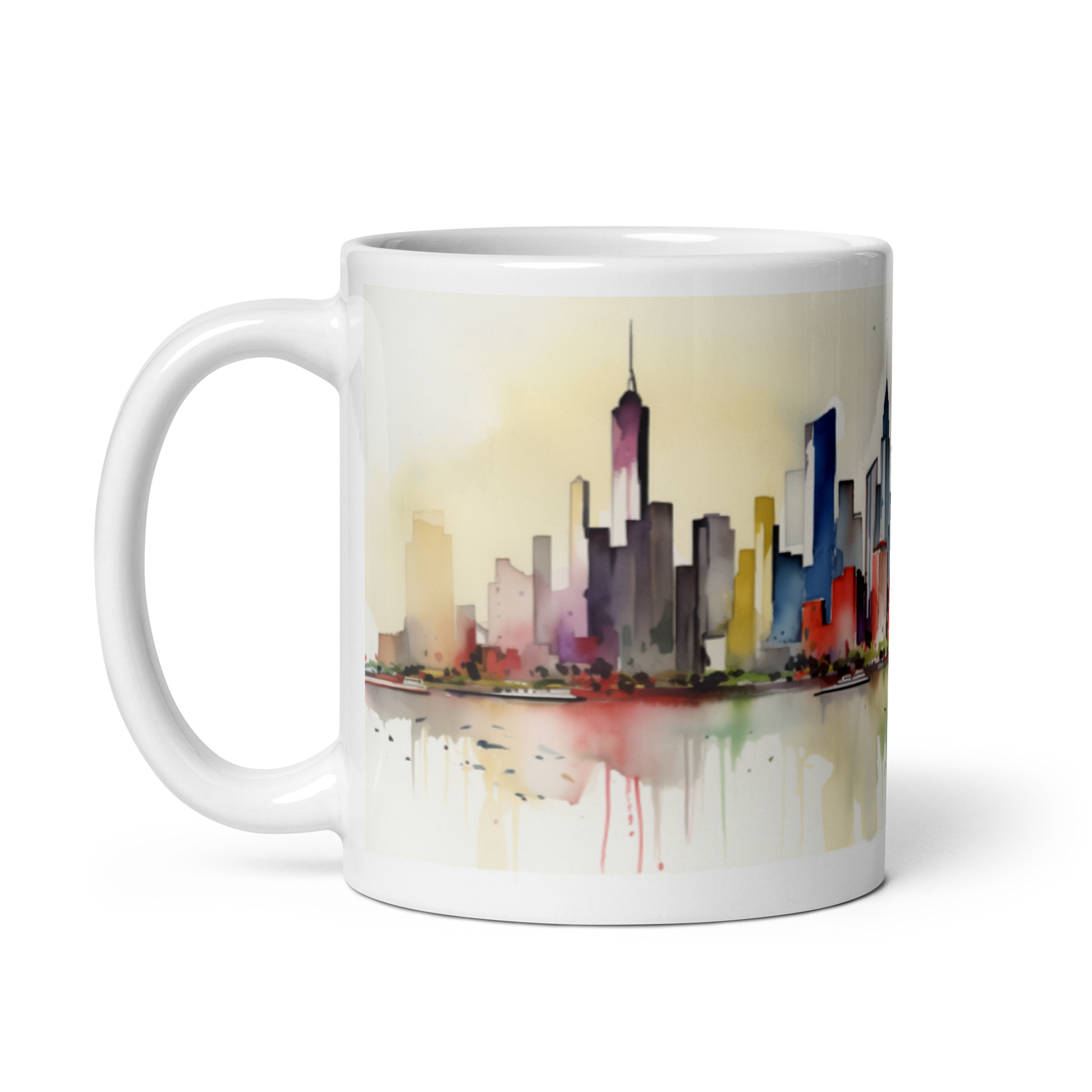 This glossy white mug features a scenic watercolour painting of New York City wrapped around the side.