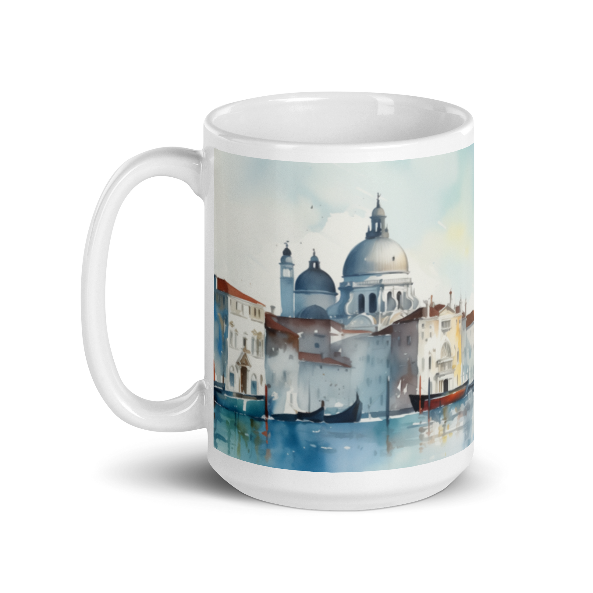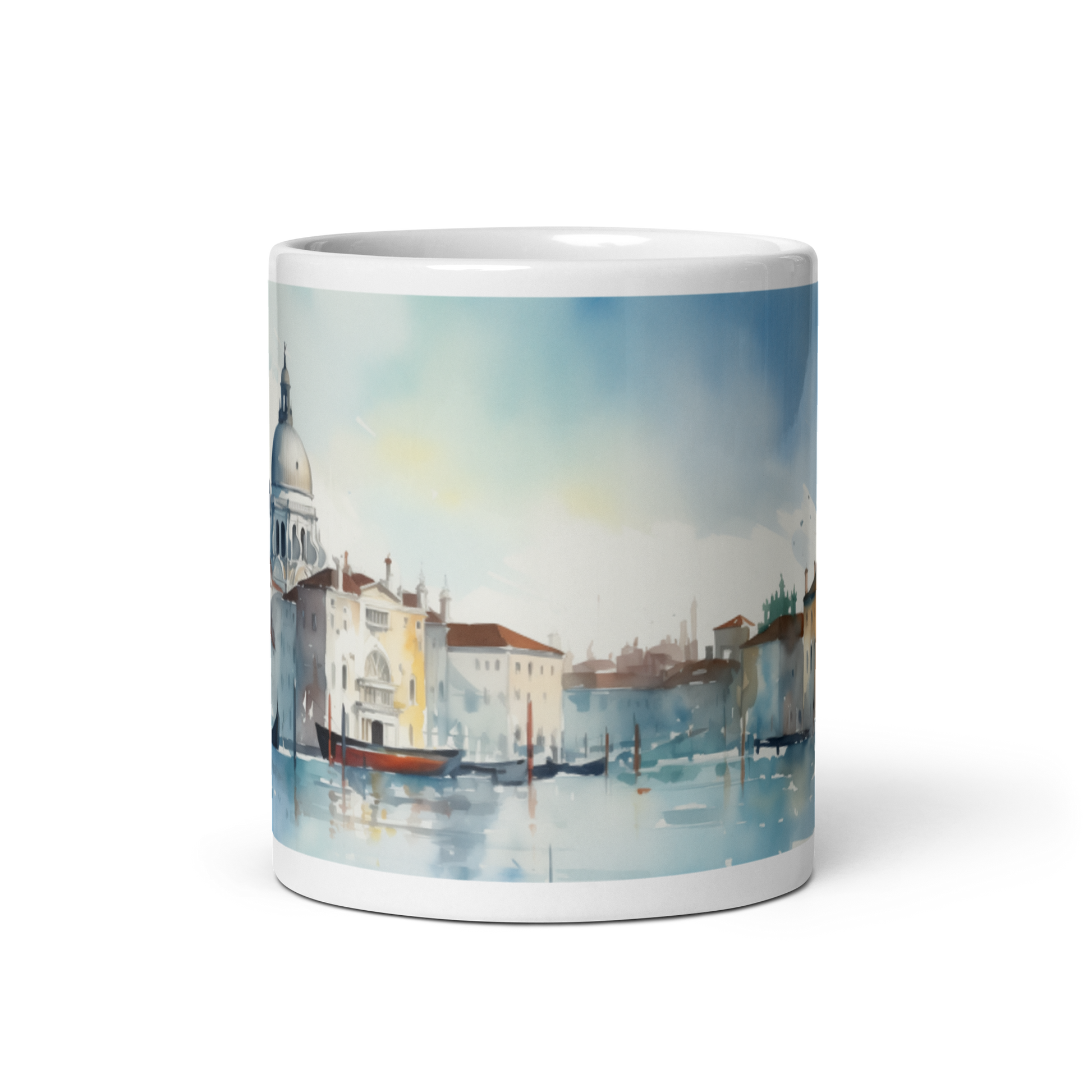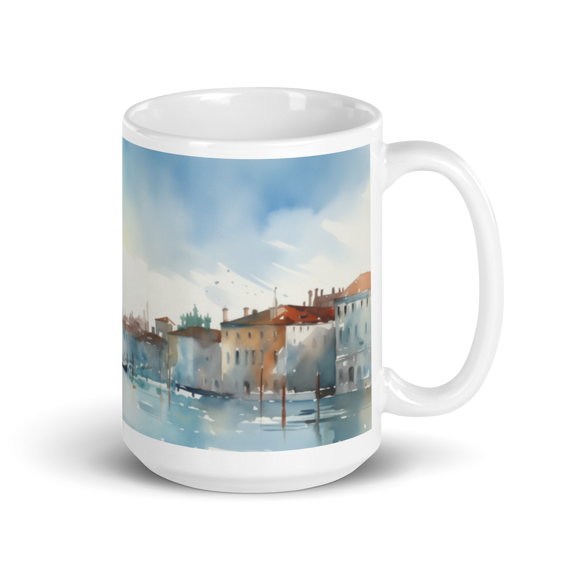This glossy white mug features a watercolour painting of Venice wrapped around the side.