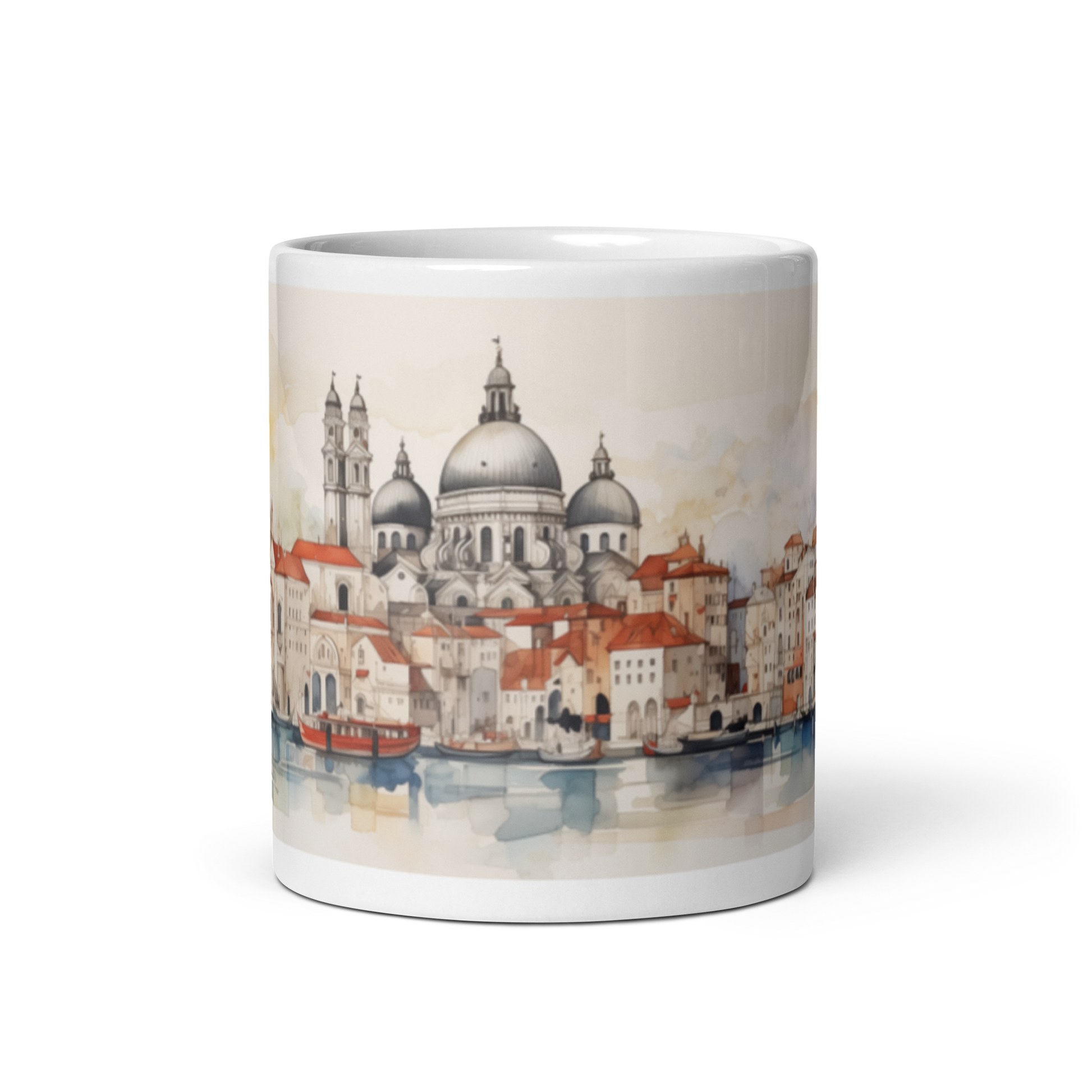 This glossy white mug features a watercolour painting of Venice wrapped around the side.