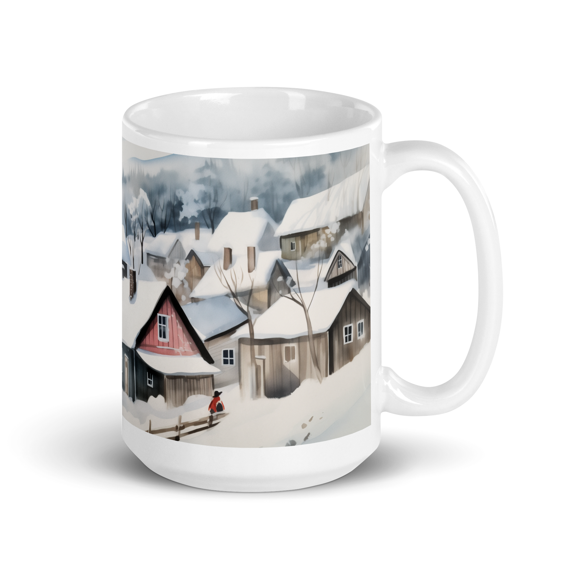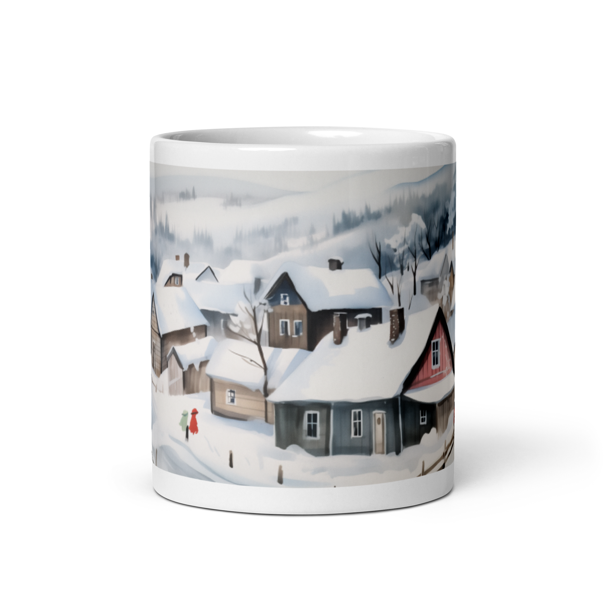 This glossy white mug features a watercolour painting of a village in winter wrapped around the side.