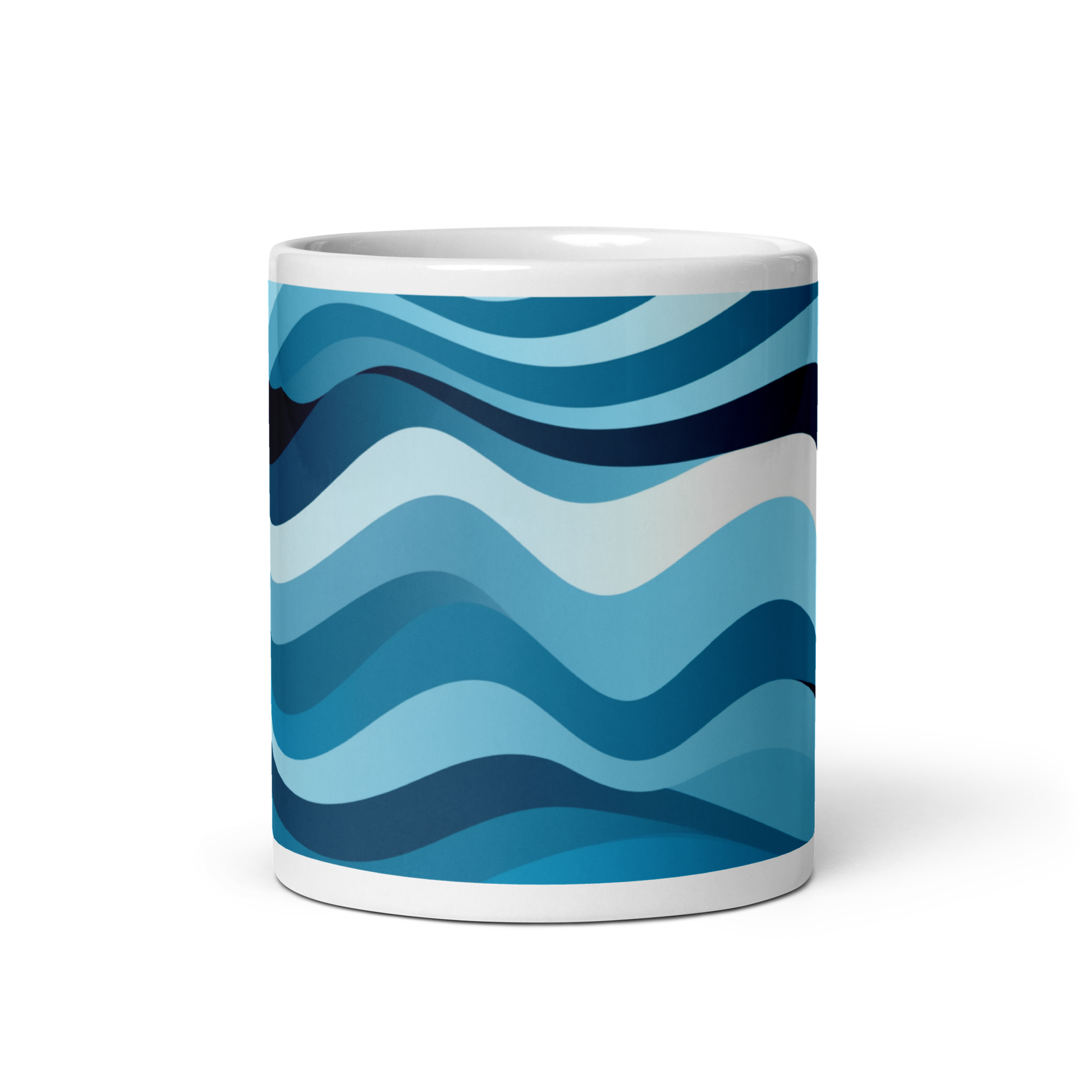 This glossy white mug features a wavy blue pattern wrapped around the side.