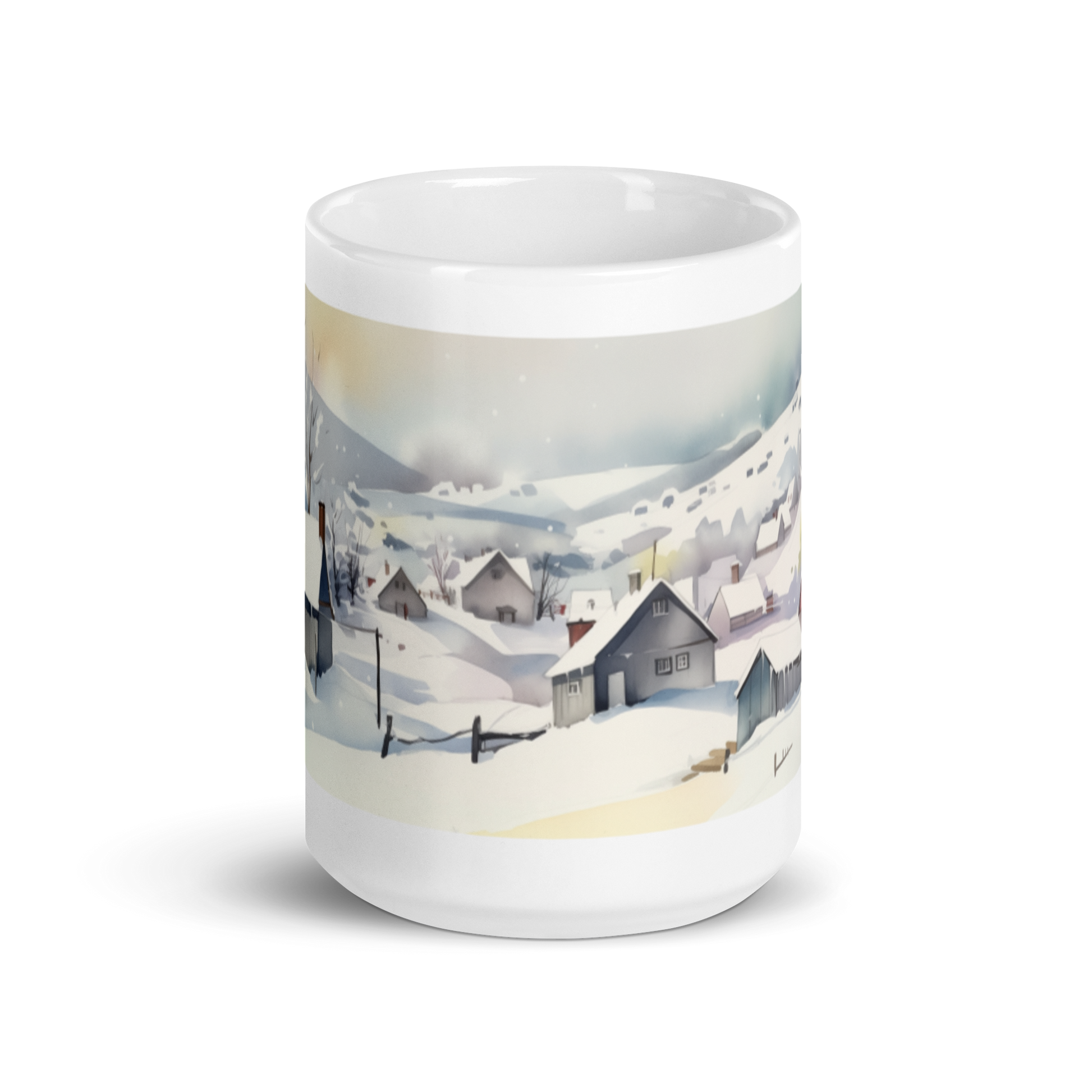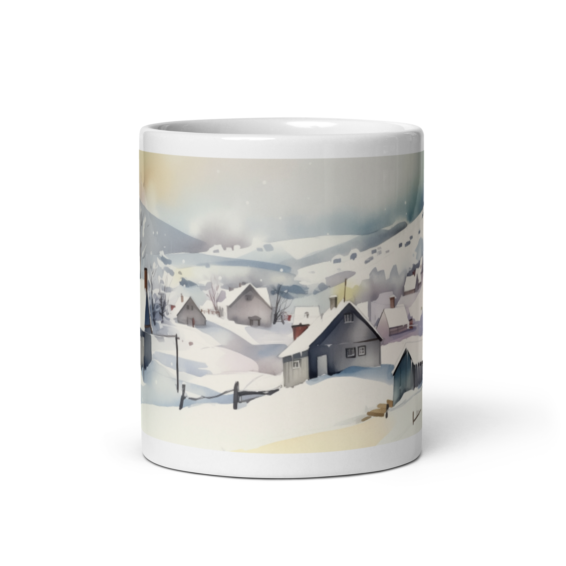 This glossy white mug features a watercolour painting of a village in winter wrapped around the side.
